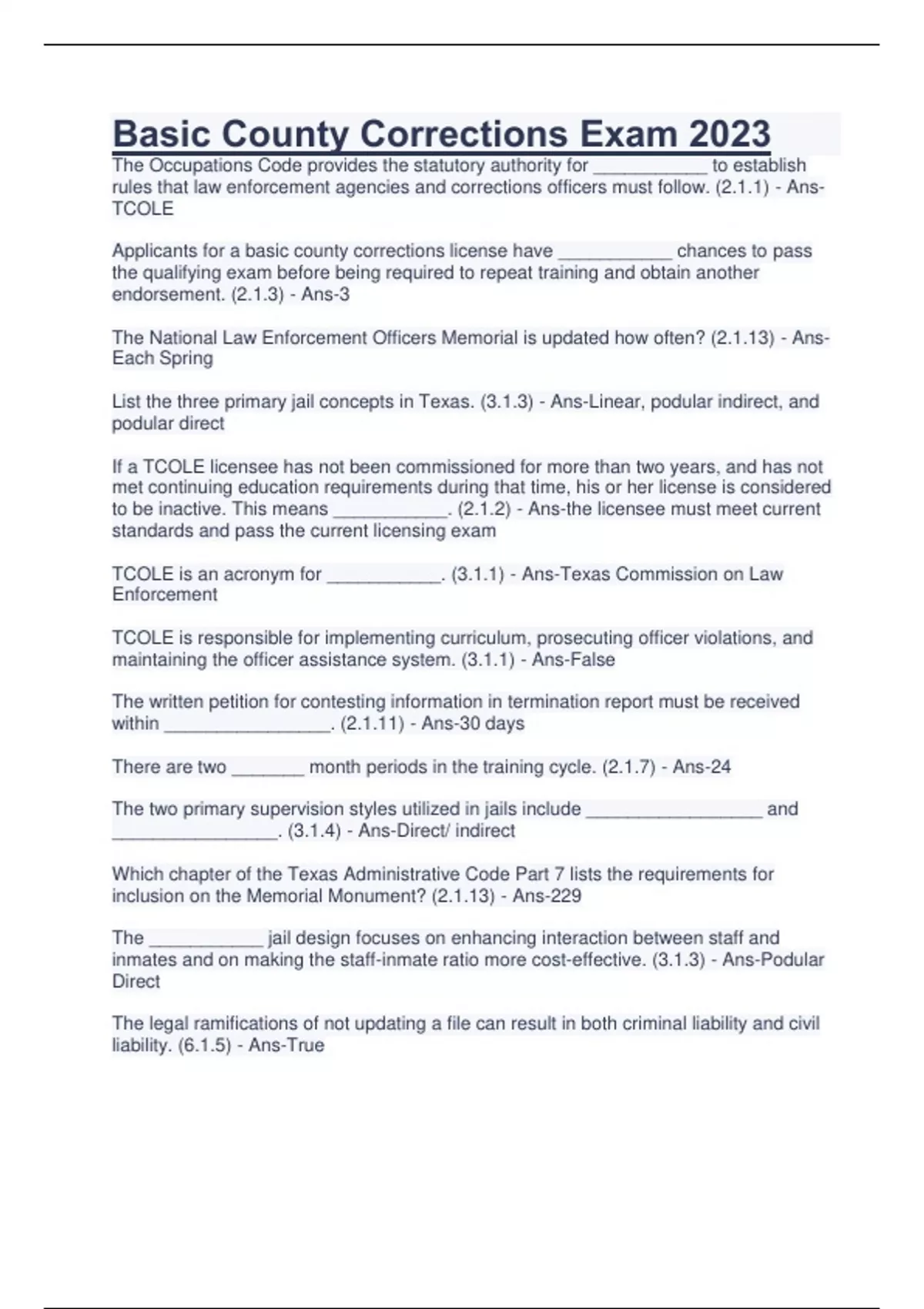 Basic County Corrections Exam 2023 The Occupations Code provides the statutory authority for ___________ to establish rules that law enforcement agencies and corrections officers must follow. (2.1.1) - AnsTCOLE Applicants for a basic county corrections license have ___________ chances to pass the qualifying exam before being required to repeat training and obtain another endorsement. (2.1.3) - Ans-3 The National Law Enforcement Officers Memorial is updated how often? (2.1.13) - AnsEach Spring List the three primary jail concepts in Texas. (3.1.3) - Ans-Linear, podular indirect, and podular direct If a TCOLE licensee has not been commissioned for more than two years, and has not met continuing education requirements during that time, his or her license is considered to be inactive. This means ___________. (2.1.2) - Ans-the licensee must meet current standards and pass the current licensing exam TCOLE is an acronym for ___________. (3.1.1) - Ans-Texas Commission on Law Enforcement TCOLE is responsible for implementing curriculum, prosecuting officer violations, and maintaining the officer assistance system. (3.1.1) - Ans-False The written petition for contesting information in termination report must be received within ________________. (2.1.11) - Ans-30 days There are two _______ month periods in the training cycle. (2.1.7) - Ans-24 The two primary supervision styles utilized in jails include _________________ and ________________. (3.1.4) - Ans-Direct/ indirect Which chapter of the Texas Administrative Code Part 7 lists the requirements for inclusion on the Memorial Monument? (2.1.13) - Ans-229 The ___________ jail design focuses on enhancing interaction between staff and inmates and on making the staff-inmate ratio more cost-effective. (3.1.3) - Ans-Podular Direct The legal ramifications of not updating a file can result in both criminal liability and civil liability. (6.1.5) - Ans-True Refusing to give your name, residence address, or date of birth to a peace officer who has made a lawful arrest and request is a violation of Ch. 38.02 of the Penal Code entitled ___________. (6.2.1) - Ans-Failure to identify When describing an inmate's engagement ring during intake inventory, which of the following characteristic should you NOT include in your report? (6.4.2) - Ans-Gem Name Which of the following is a purpose of the Suicide Screening Form? (5.3.4) - Ans-- Triage those at risk for suicide - Identify inmates possibly in distress from psychosis - Assist with continuity of care of special needs inmates A ___________ is an order signed by a magistrate directing a sheriff to receive and place in jail a person so committed. (6.1.1) - Ans-Commitment Advantages to objective jail classification include all of the following, except ___________. (7.2.5) - Ans-provides a subjective classification of inmates Female inmates shall be ___________ by sight and sound from male inmates. (7.2.2) - Ans-Separated If a jailer is trusting and familiar with the inmates, the inmates will place this jailer in the _________ category. (11.6.3) - Ans-Soft When completing fingerprinting, the option to submit to ___________ must be checked before clicking the submit button. (6.2.4) - Ans-DPS During intake procedures, if a foreign national's country of citizenship is not on the mandatory notification list, you should do which of the following? (6.7.2) - Ans--Offer to notify the inmate's consular - Inform the inmate about you making the notification - Notify the consular without delay if the inmate agrees to notification A concept that can be used to improve staff and inmate relations includes ___________. (3.1.6) - Ans-Firm but fair conduct When describing an inmate's watch during intake inventory, which of the following characteristic should you NOT include in your report? (6.4.2) - Ans-Estimated Value Stress can cause physical illnesses, burnout, excessive disability retirement, and impaired ___________. (4.5.5) - Ans-Family Relationships A report form that documents an agency's authority to retain a person in custody pending a fulfillment of a legal obligation or transfer to another jurisdiction is a ___________. (6.3.3) - Ans-Detainer CONTINUES.....