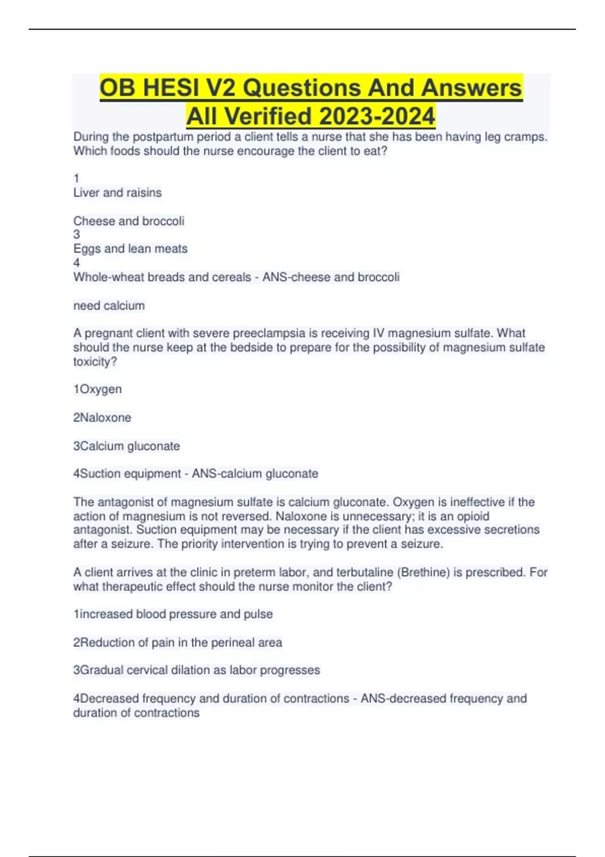 OB HESI V2 Questions And Answers All Verified During the postpartum period a client tells a nurse that she has been having leg cramps. Which foods should the nurse encourage the client to eat? 1 Liver and raisins Cheese and broccoli 3 Eggs and lean meats 4 Whole-wheat breads and cereals - ANS-cheese and broccoli need calcium A pregnant client with severe preeclampsia is receiving IV magnesium sulfate. What should the nurse keep at the bedside to prepare for the possibility of magnesium sulfate toxicity? 1Oxygen 2Naloxone 3Calcium gluconate 4Suction equipment - ANS-calcium gluconate The antagonist of magnesium sulfate is calcium gluconate. Oxygen is ineffective if the action of magnesium is not reversed. Naloxone is unnecessary; it is an opioid antagonist. Suction equipment may be necessary if the client has excessive secretions after a seizure. The priority intervention is trying to prevent a seizure. A client arrives at the clinic in preterm labor, and terbutaline (Brethine) is prescribed. For what therapeutic effect should the nurse monitor the client? 1increased blood pressure and pulse 2Reduction of pain in the perineal area 3Gradual cervical dilation as labor progresses 4Decreased frequency and duration of contractions - ANS-decreased frequency and duration of contractions Terbutaline sulfate (Brethine) is a β-mimetic that acts on the smooth muscles of the uterus to reduce contractility, which in turn inhibits dilation and the frequency and duration of contractions. Although terbutaline may increase blood pressure and pulse, this is a side, not a therapeutic, effect requiring frequent assessments. Terbutaline is not an analgesic. It should stop cervical dilation rather than increase it. greenish amniotic fluid indicates - ANS-meconium in amniotic fluid and dr should be notified immediately pt on magnesium sulfide, what base line assessment is needed - ANS-repsiration rate LOC is also affected but do not need a baseline hydatidiform mole - ANS-causes extra large utereus lepolds maneuver on patient with placental previa expects - ANS-high floating, presenting part CONTINUES.....