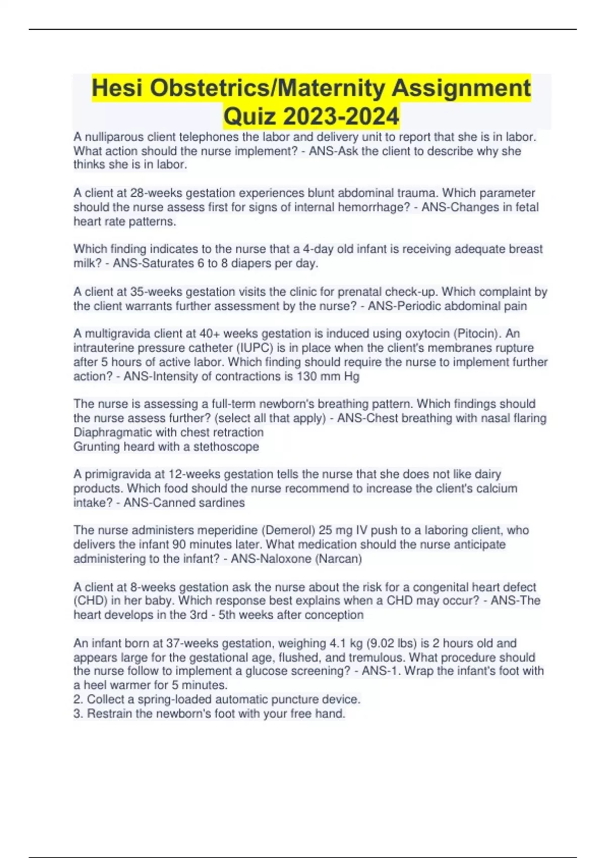Hesi Obstetrics/Maternity Assignment Quiz A nulliparous client telephones the labor and delivery unit to report that she is in labor. What action should the nurse implement? - ANS-Ask the client to describe why she thinks she is in labor. A client at 28-weeks gestation experiences blunt abdominal trauma. Which parameter should the nurse assess first for signs of internal hemorrhage? - ANS-Changes in fetal heart rate patterns. Which finding indicates to the nurse that a 4-day old infant is receiving adequate breast milk? - ANS-Saturates 6 to 8 diapers per day. A client at 35-weeks gestation visits the clinic for prenatal check-up. Which complaint by the client warrants further assessment by the nurse? - ANS-Periodic abdominal pain A multigravida client at 40+ weeks gestation is induced using oxytocin (Pitocin). An intrauterine pressure catheter (IUPC) is in place when the client's membranes rupture after 5 hours of active labor. Which finding should require the nurse to implement further action? - ANS-Intensity of contractions is 130 mm Hg The nurse is assessing a full-term newborn's breathing pattern. Which findings should the nurse assess further? (select all that apply) - ANS-Chest breathing with nasal flaring Diaphragmatic with chest retraction Grunting heard with a stethoscope A primigravida at 12-weeks gestation tells the nurse that she does not like dairy products. Which food should the nurse recommend to increase the client's calcium intake? - ANS-Canned sardines The nurse administers meperidine (Demerol) 25 mg IV push to a laboring client, who delivers the infant 90 minutes later. What medication should the nurse anticipate administering to the infant? - ANS-Naloxone (Narcan) A client at 8-weeks gestation ask the nurse about the risk for a congenital heart defect (CHD) in her baby. Which response best explains when a CHD may occur? - ANS-The heart develops in the 3rd - 5th weeks after conception An infant born at 37-weeks gestation, weighing 4.1 kg (9.02 lbs) is 2 hours old and appears large for the gestational age, flushed, and tremulous. What procedure should the nurse follow to implement a glucose screening? - ANS-1. Wrap the infant's foot with a heel warmer for 5 minutes. 2. Collect a spring-loaded automatic puncture device. 3. Restrain the newborn's foot with your free hand CONTINUES....