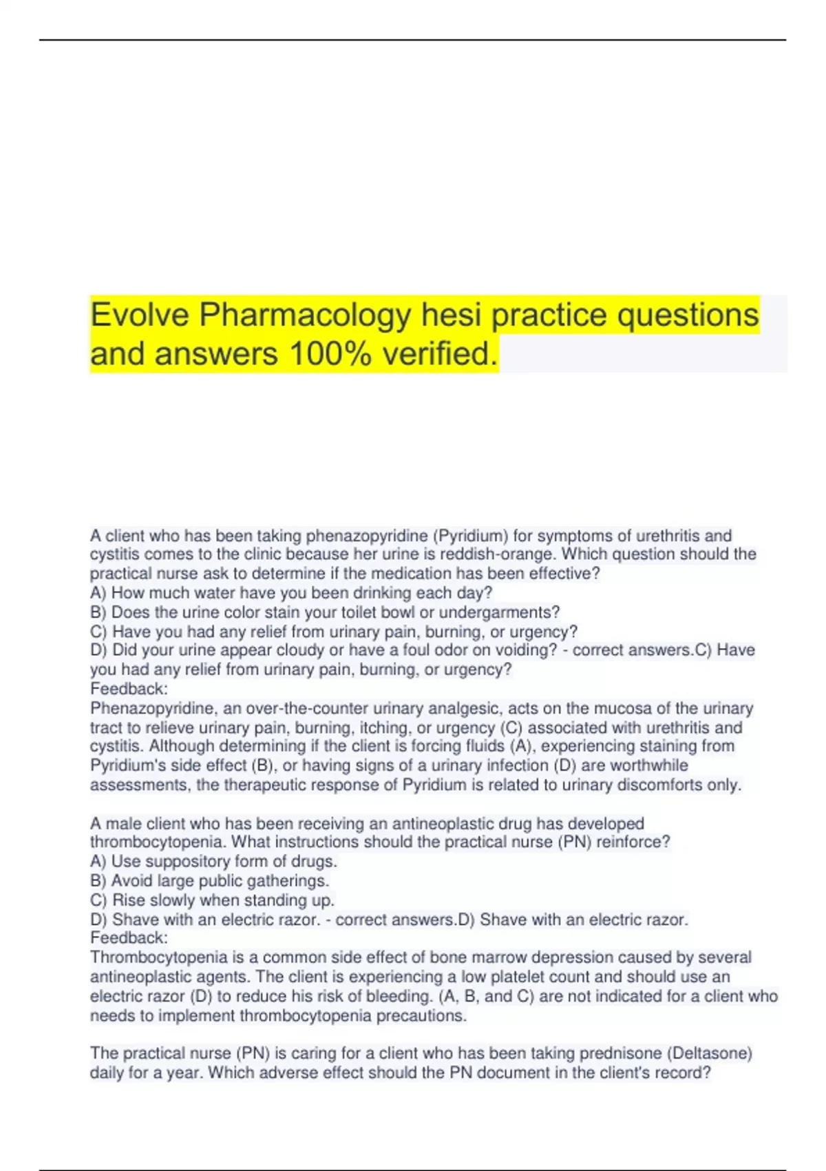 Evolve Pharmacology hesi practice questions and answers 100% verified. A client who has been taking phenazopyridine (Pyridium) for symptoms of urethritis and cystitis comes to the clinic because her urine is reddish-orange. Which question should the practical nurse ask to determine if the medication has been effective? A) How much water have you been drinking each day? B) Does the urine color stain your toilet bowl or undergarments? C) Have you had any relief from urinary pain, burning, or urgency? D) Did your urine appear cloudy or have a foul odor on voiding? - correct answers.C) Have you had any relief from urinary pain, burning, or urgency? Feedback: Phenazopyridine, an over-the-counter urinary analgesic, acts on the mucosa of the urinary tract to relieve urinary pain, burning, itching, or urgency (C) associated with urethritis and cystitis. Although determining if the client is forcing fluids (A), experiencing staining from Pyridium's side effect (B), or having signs of a urinary infection (D) are worthwhile assessments, the therapeutic response of Pyridium is related to urinary discomforts only. A male client who has been receiving an antineoplastic drug has developed thrombocytopenia. What instructions should the practical nurse (PN) reinforce? A) Use suppository form of drugs. B) Avoid large public gatherings. C) Rise slowly when standing up. D) Shave with an electric razor. - correct answers.D) Shave with an electric razor. Feedback: Thrombocytopenia is a common side effect of bone marrow depression caused by several antineoplastic agents. The client is experiencing a low platelet count and should use an electric razor (D) to reduce his risk of bleeding. (A, B, and C) are not indicated for a client who needs to implement thrombocytopenia precautions. The practical nurse (PN) is caring for a client who has been taking prednisone (Deltasone) daily for a year. Which advers
