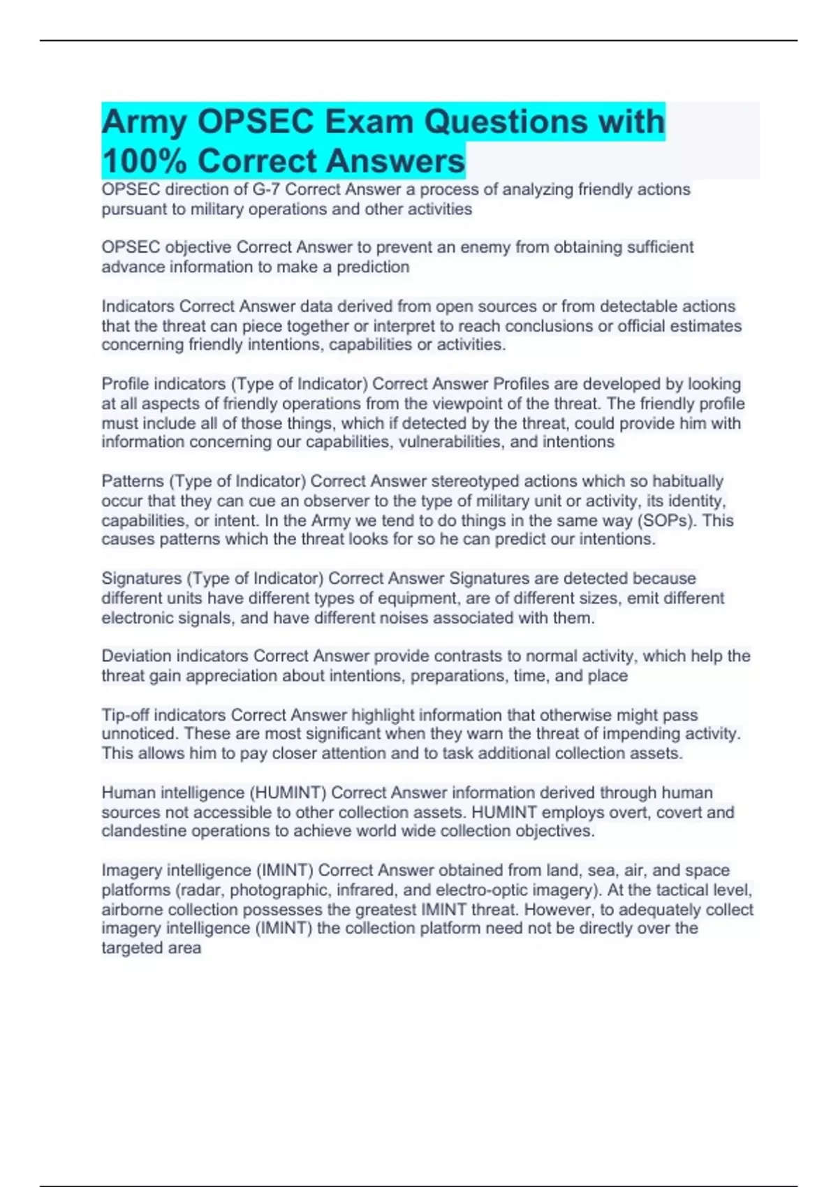 OPSEC direction of G-7 Correct Answer a process of analyzing friendly actions pursuant to military operations and other activities OPSEC objective Correct Answer to prevent an enemy from obtaining sufficient advance information to make a prediction Indicators Correct Answer data derived from open sources or from detectable actions that the threat can piece together or interpret to reach conclusions or official estimates concerning friendly intentions, capabilities or activities. Profile indicators (Type of Indicator) Correct Answer Profiles are developed by looking at all aspects of friendly operations from the viewpoint of the threat. The friendly profile must include all of those things, which if detected by the threat, could provide him with information concerning our capabilities, vulnerabilities, and intentions Patterns (Type of Indicator) Correct Answer stereotyped actions which so habitually occur that they can cue an observer to the type of military unit or activity, its identity, capabilities, or intent. In the Army we tend to do things in the same way (SOPs). This causes patterns which the threat looks for so he can predict our intentions. Signatures (Type of Indicator) Correct Answer Signatures are detected because different units have different types of equipment, are of different sizes, emit different electronic signals, and have different noises associated with them. Deviation indicators Correct Answer provide contrasts to normal activity, which help the threat gain appreciation about intentions, preparations, time, and place Tip-off indicators Correct Answer highlight information that otherwise might pass unnoticed. These are most significant when they warn the threat of impending activity. This allows him to pay closer attention and to task additional collection assets. Human intelligence (HUMINT) Correct Answer information derived through human sources not accessible to other collection assets. HUMINT employs overt, covert and clandestine operations to achieve world wide collection objectives. Imagery intelligence (IMINT) Correct Answer obtained from land, sea, air, and space platforms (radar, photographic, infrared, and electro-optic imagery). At the tactical level, airborne collection possesses the greatest IMINT threat. However, to adequately collect imagery intelligence (IMINT) the collection platform need not be directly over the targeted area