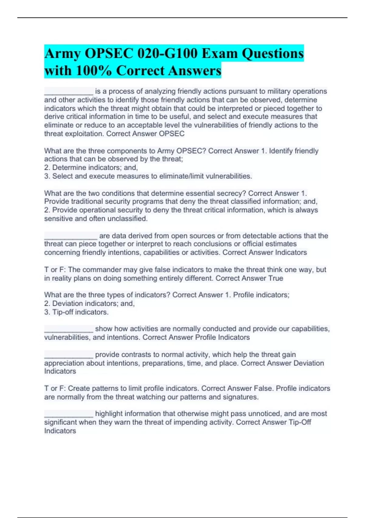 Army OPSEC 020-G100 Exam Questions with 100% Correct Answers