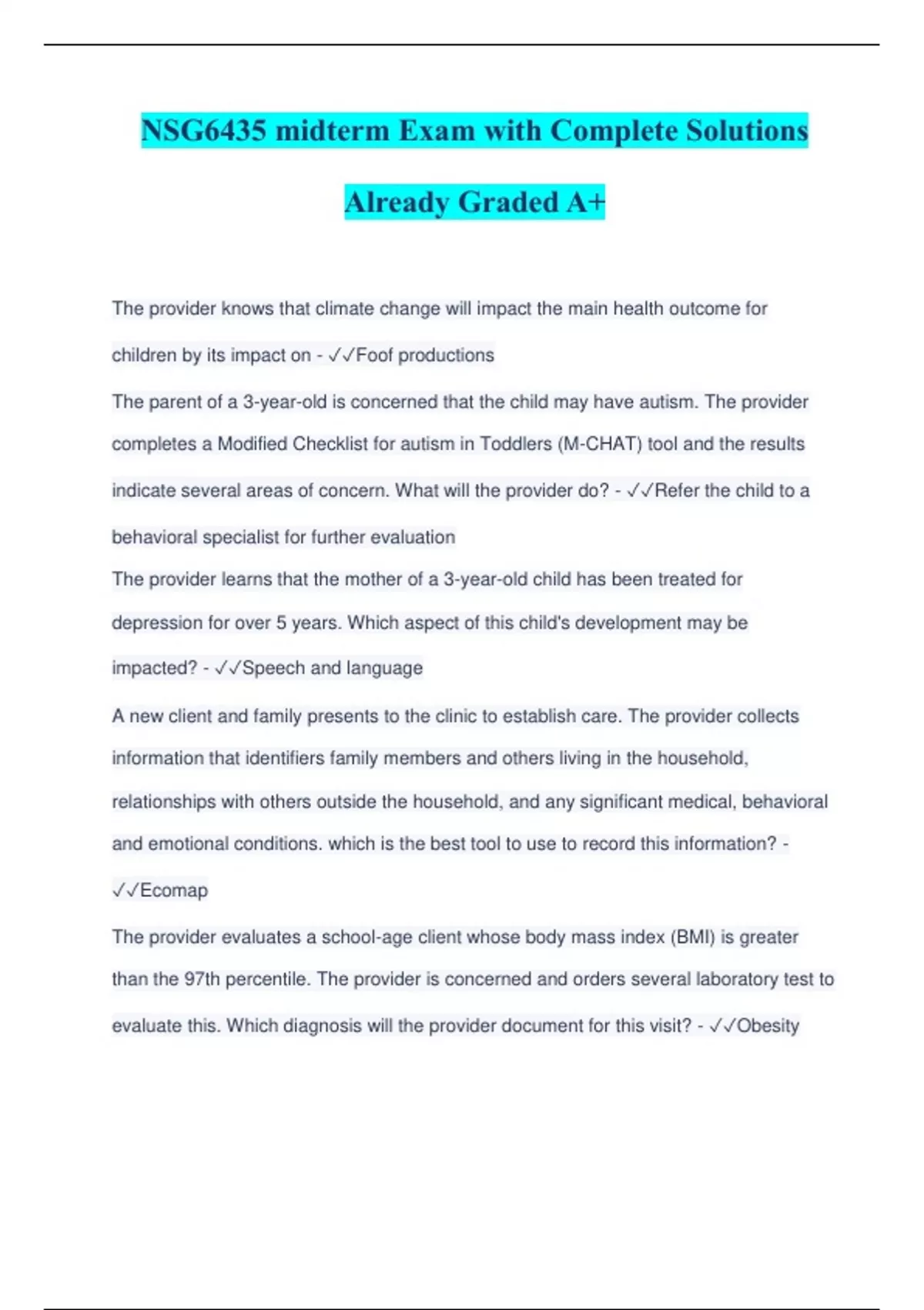 NSG6435 midterm Exam with Complete Solutions Already Graded A+ The provider knows that climate change will impact the main health outcome for children by its impact on - Foof productions The parent of a 3-year-old is concerned that the child may have autism. The provider completes a Modified Checklist for autism in Toddlers (M-CHAT) tool and the results indicate several areas of concern. What will the provider do? - Refer the child to a behavioral specialist for further evaluation The provider learns that the mother of a 3-year-old child has been treated for depression for over 5 years. Which aspect of this child's development may be impacted? - Speech and language A new client and family presents to the clinic to establish care. The provider collects information that identifiers family members and others living in the household, relationships with others outside the household, and any significant medical, behavioral and emotional conditions. which is the best tool to use to record this information? - Ecomap The provider evaluates a school-age client whose body mass index (BMI) is greater than the 97th percentile. The provider is concerned and orders several laboratory test to evaluate this. Which diagnosis will the provider document for this visit? - Obesit