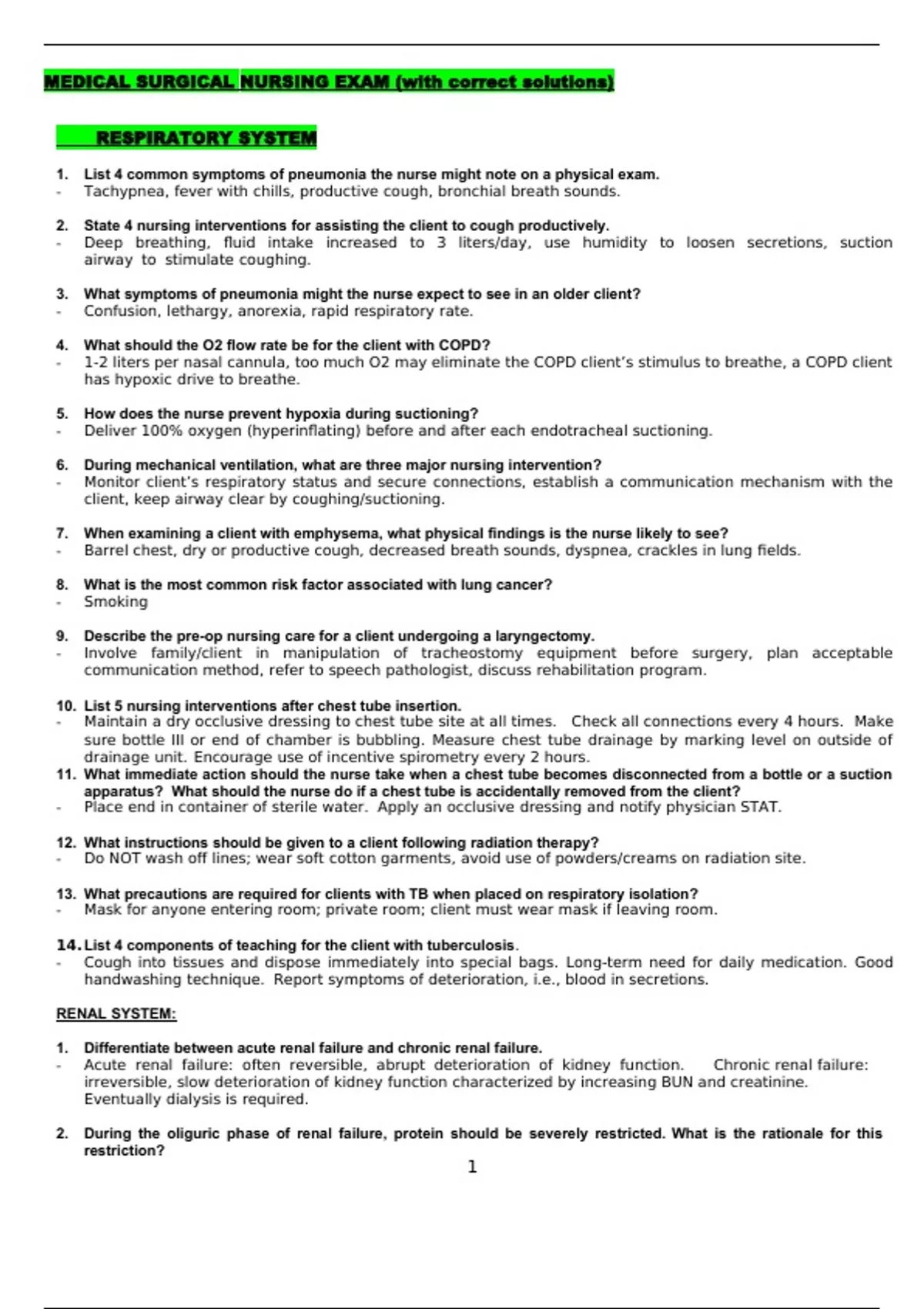 MEDICAL SURGICAL NURSING EXAM (with correct solutions) RESPIRATORY SYSTEM