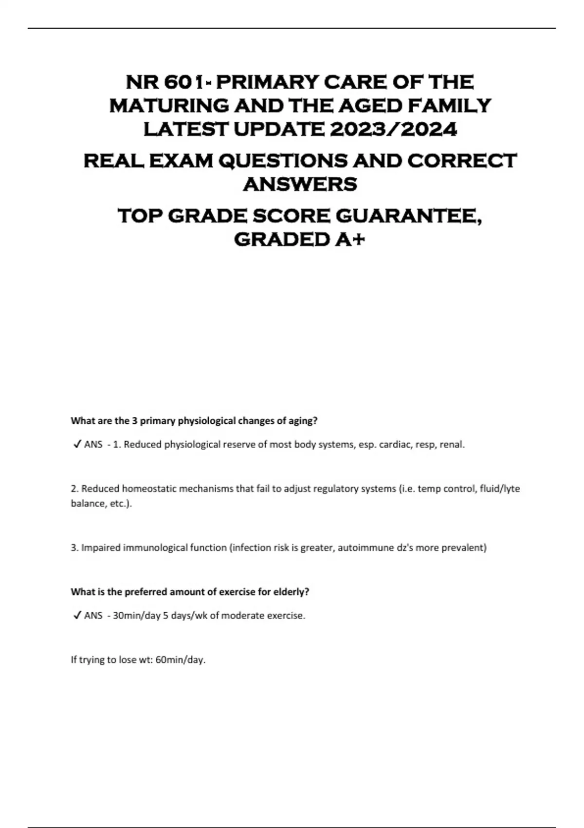 NR 601- PRIMARY CARE OF THE MATURING AND THE AGED FAMILY LATEST UPDATE 2023/2024 REAL EXAM QUESTIONS AND CORRECT ANSWERS TOP GRADE SCORE GUARANTEE, GRADED A+