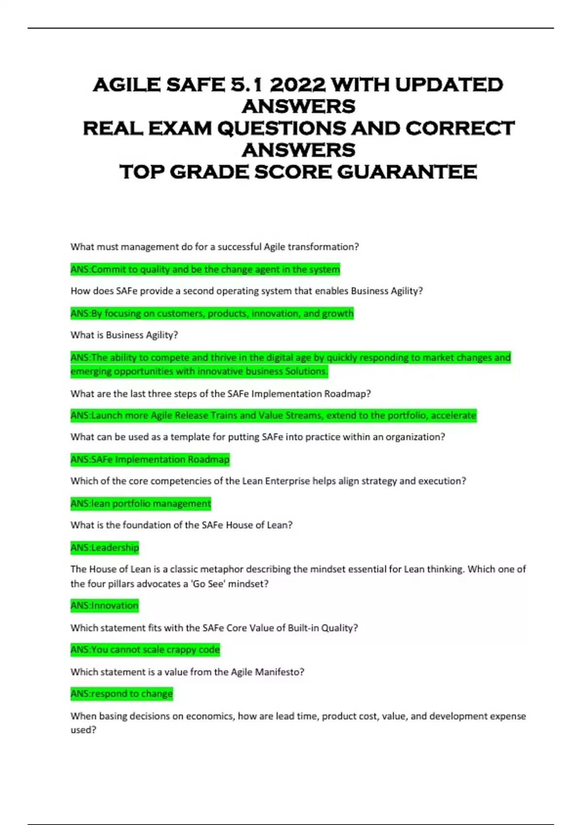 AGILE SAFE 5.1 2022 WITH UPDATED ANSWERS REAL EXAM QUESTIONS AND CORRECT ANSWERS TOP GRADE SCORE GUARANTEE