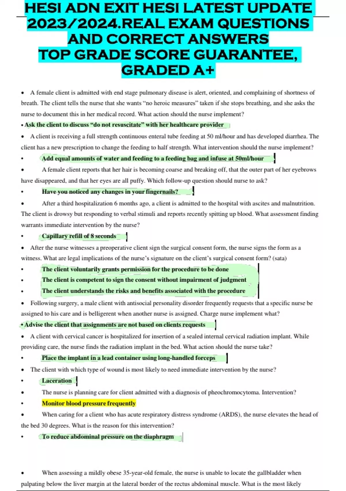 HESI ADN EXIT HESI LATEST UPDATE 2023/2024.REAL EXAM QUESTIONS AND CORRECT ANSWERS TOP GRADE SCORE GUARANTEE, GRADED A+