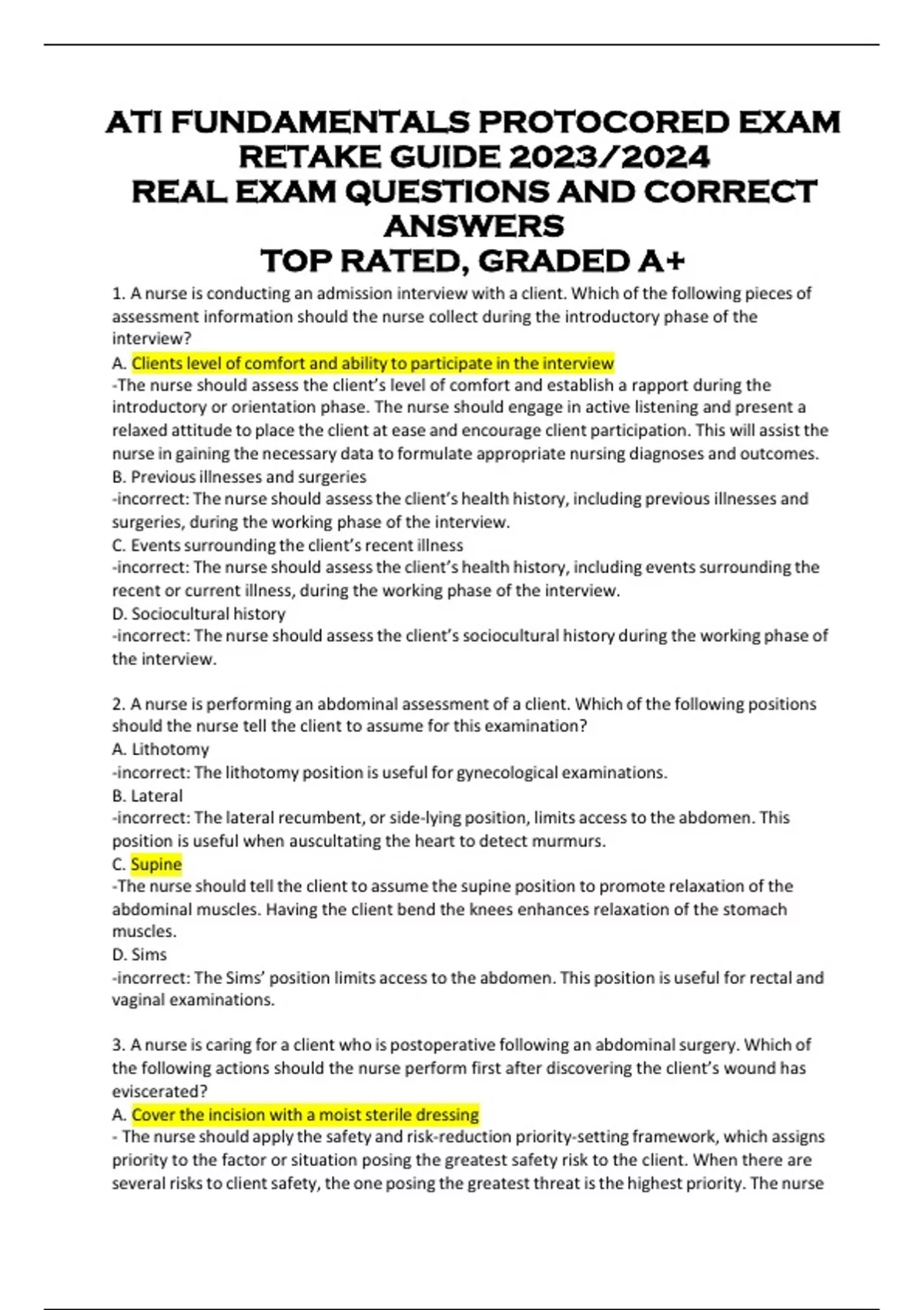 ATI FUNDAMENTALS PROTOCORED EXAM RETAKE GUIDE 2023/2024 REAL EXAM QUESTIONS AND CORRECT ANSWERS TOP RATED, GRADED A+