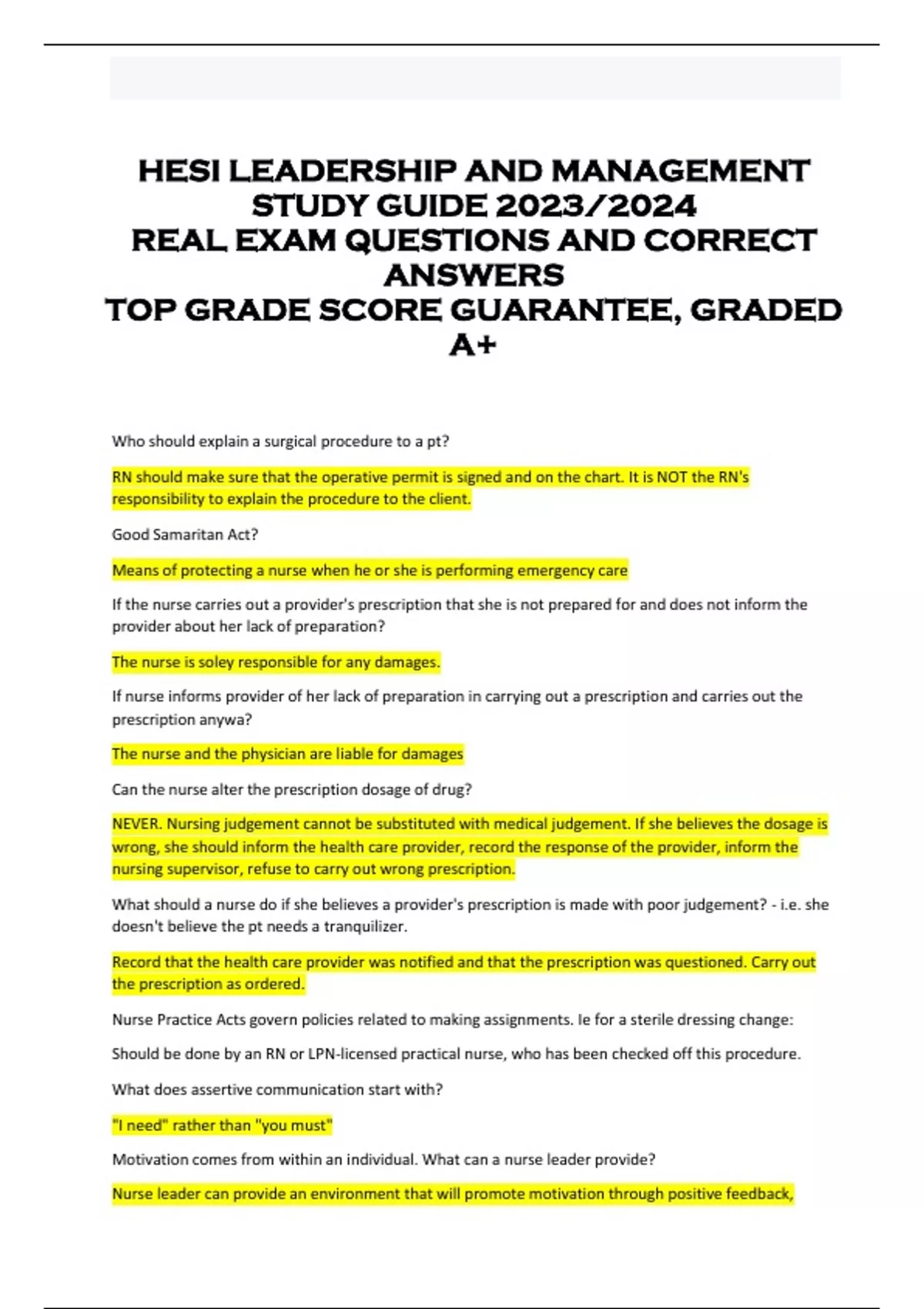 HESI LEADERSHIP AND MANAGEMENT STUDY GUIDE 2023/2024 REAL EXAM QUESTIONS AND CORRECT ANSWERS TOP GRADE SCORE GUARANTEE, GRADED A+