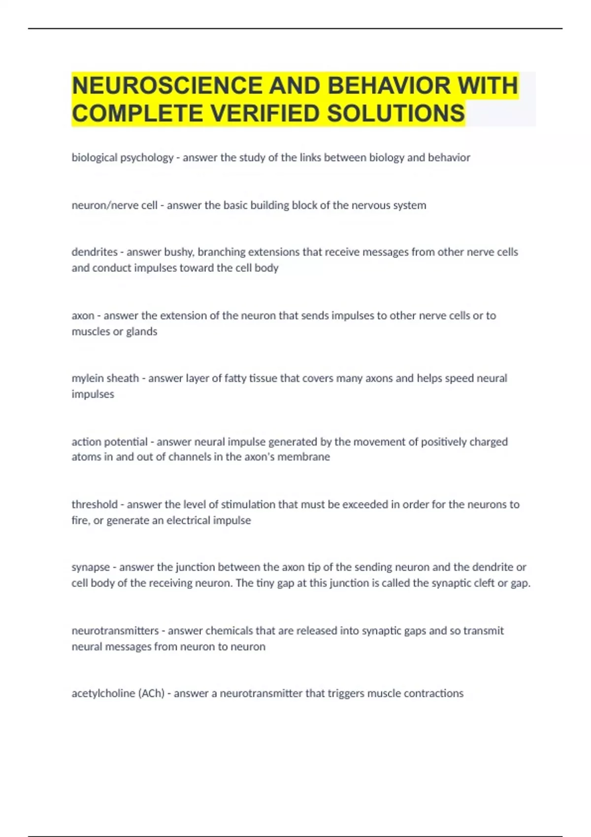 NEUROSCIENCE AND BEHAVIOR WITH COMPLETE VERIFIED SOLUTIONS.