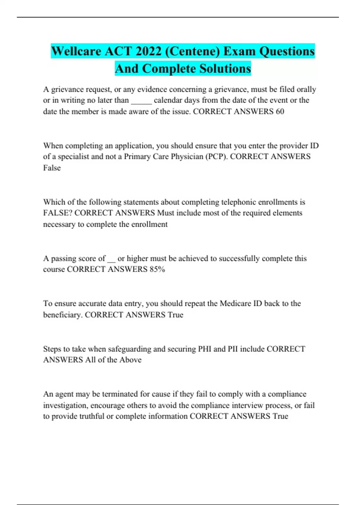 Exam of 4 pages for the course wellcare certification at wellcare certification (Wellcare ACT 2022)