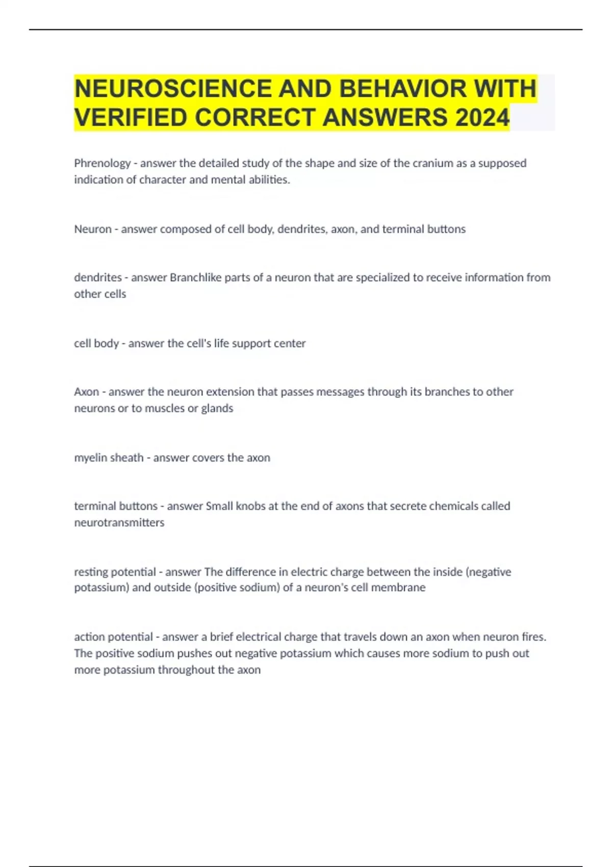 NEUROSCIENCE AND BEHAVIOR WITH VERIFIED CORRECT ANSWERS 2024