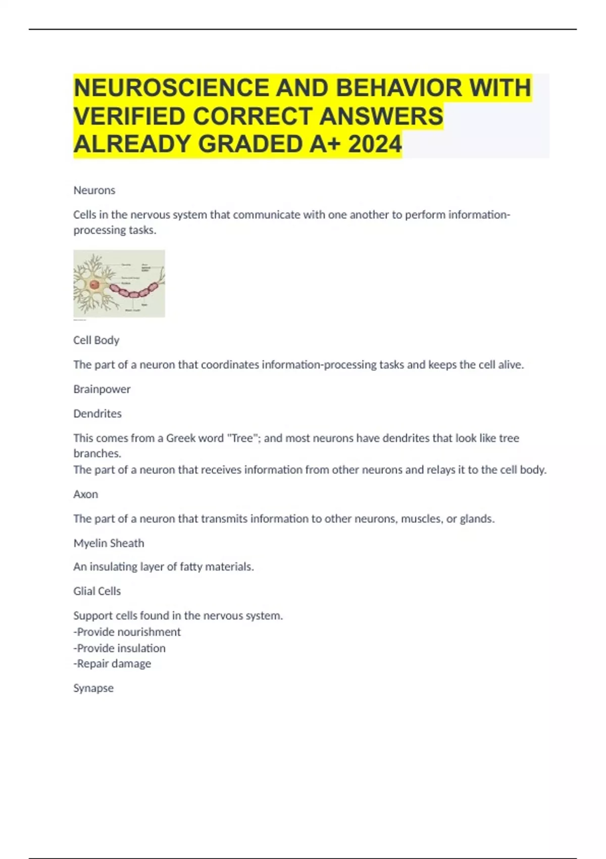 NEUROSCIENCE AND BEHAVIOR WITH VERIFIED CORRECT ANSWERS ALREADY GRADED A+