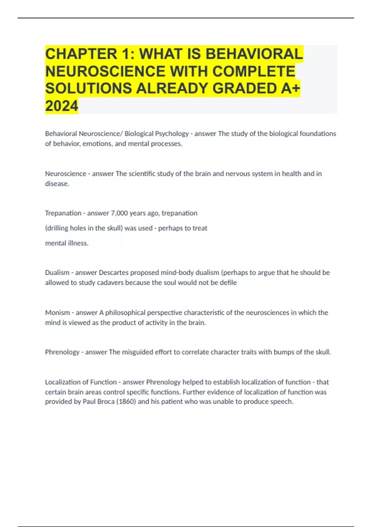 CHAPTER 1 WHAT IS BEHAVIORAL NEUROSCIENCE WITH COMPLETE SOLUTIONS ALREADY GRADED