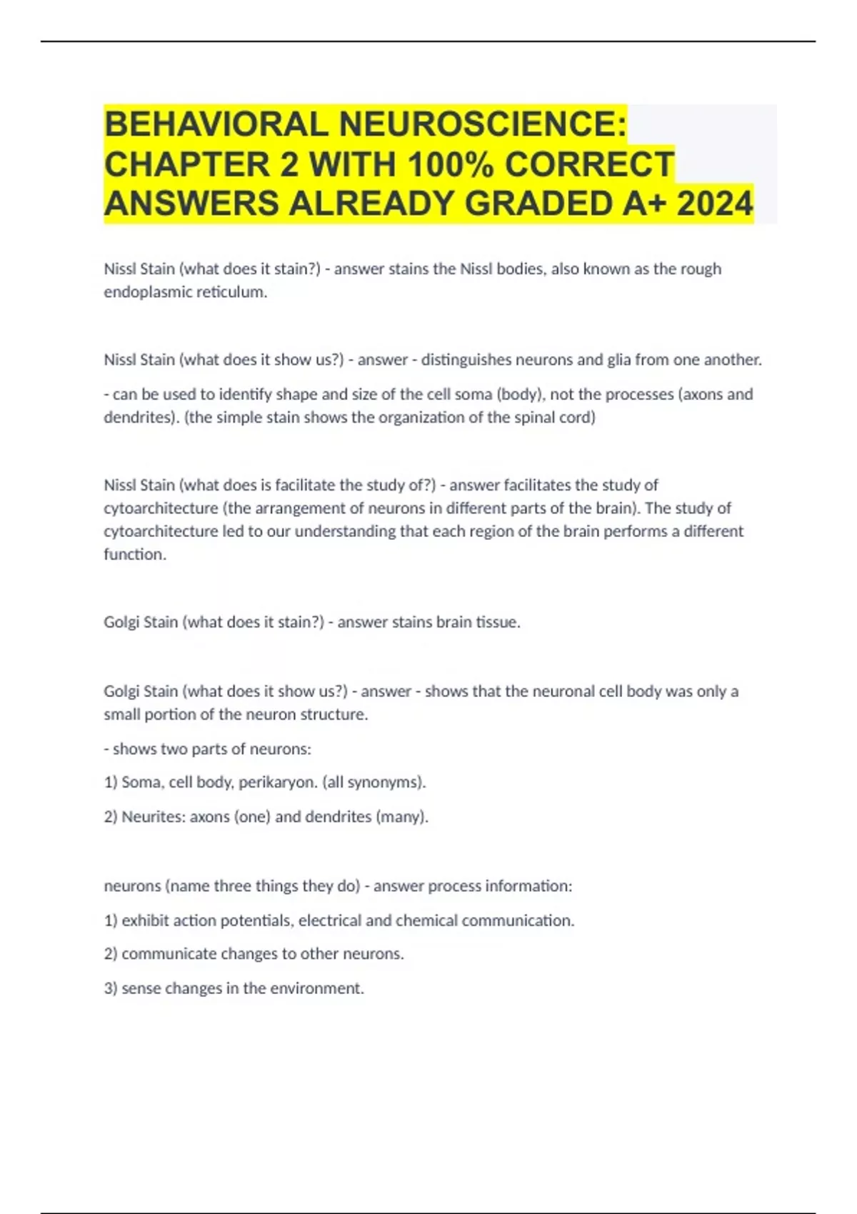 BEHAVIORAL NEUROSCIENCE CHAPTER 2 WITH 100% CORRECT ANSWERS ALREADY GRADED A+