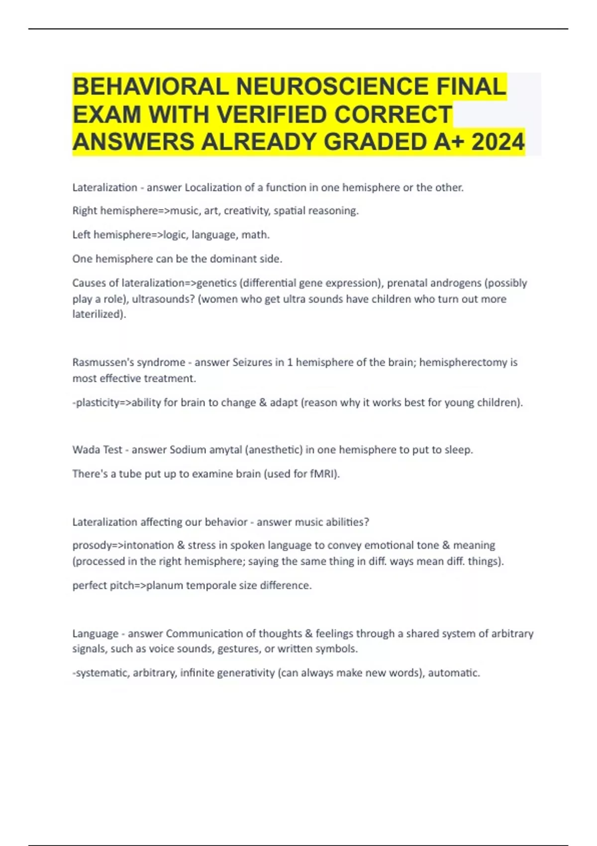 BEHAVIORAL NEUROSCIENCE FINAL EXAM WITH VERIFIED CORRECT ANSWERS ALREADY GRADED A+