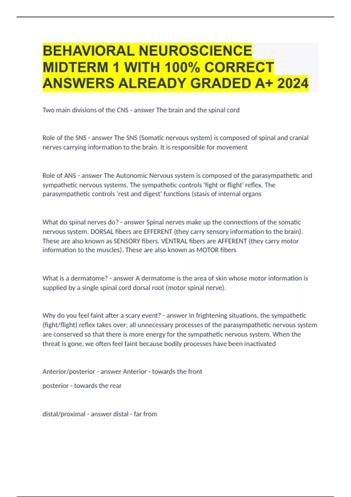 BEHAVIORAL NEUROSCIENCE MIDTERM 1 WITH 100% CORRECT ANSWERS ALREADY GRADED A+