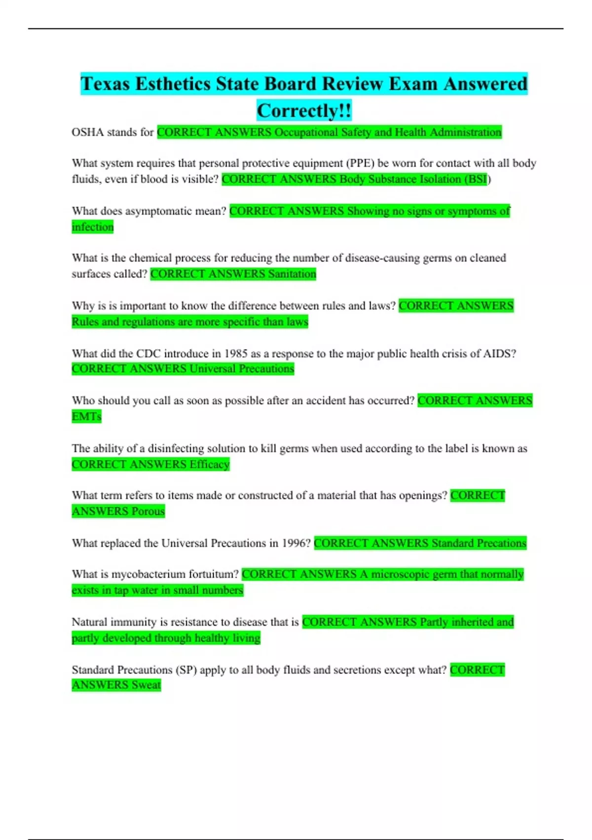 Texas Esthetics State Board Review Exam Answered Correctly