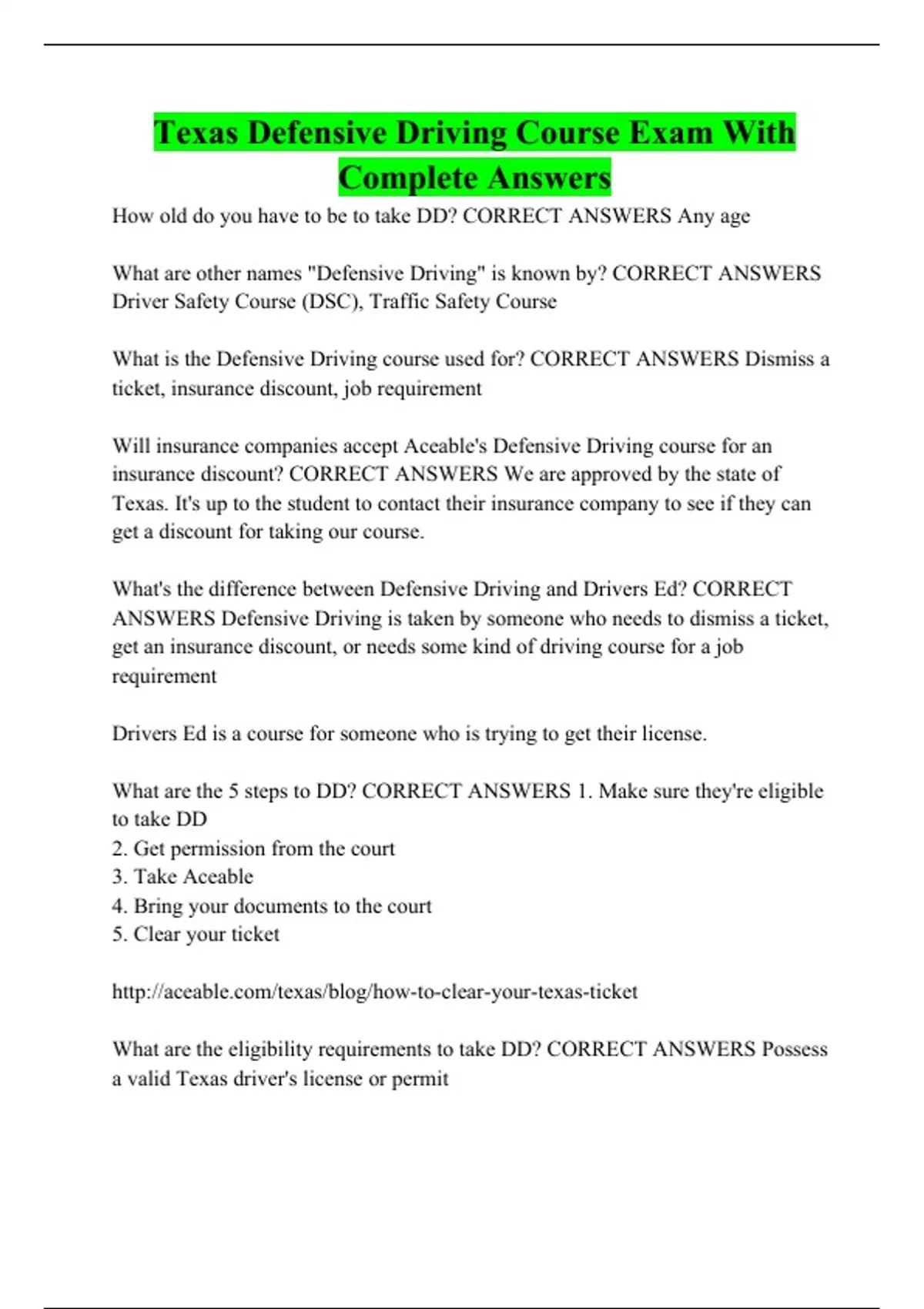 Texas Defensive Driving Course Exam With Complete Answers