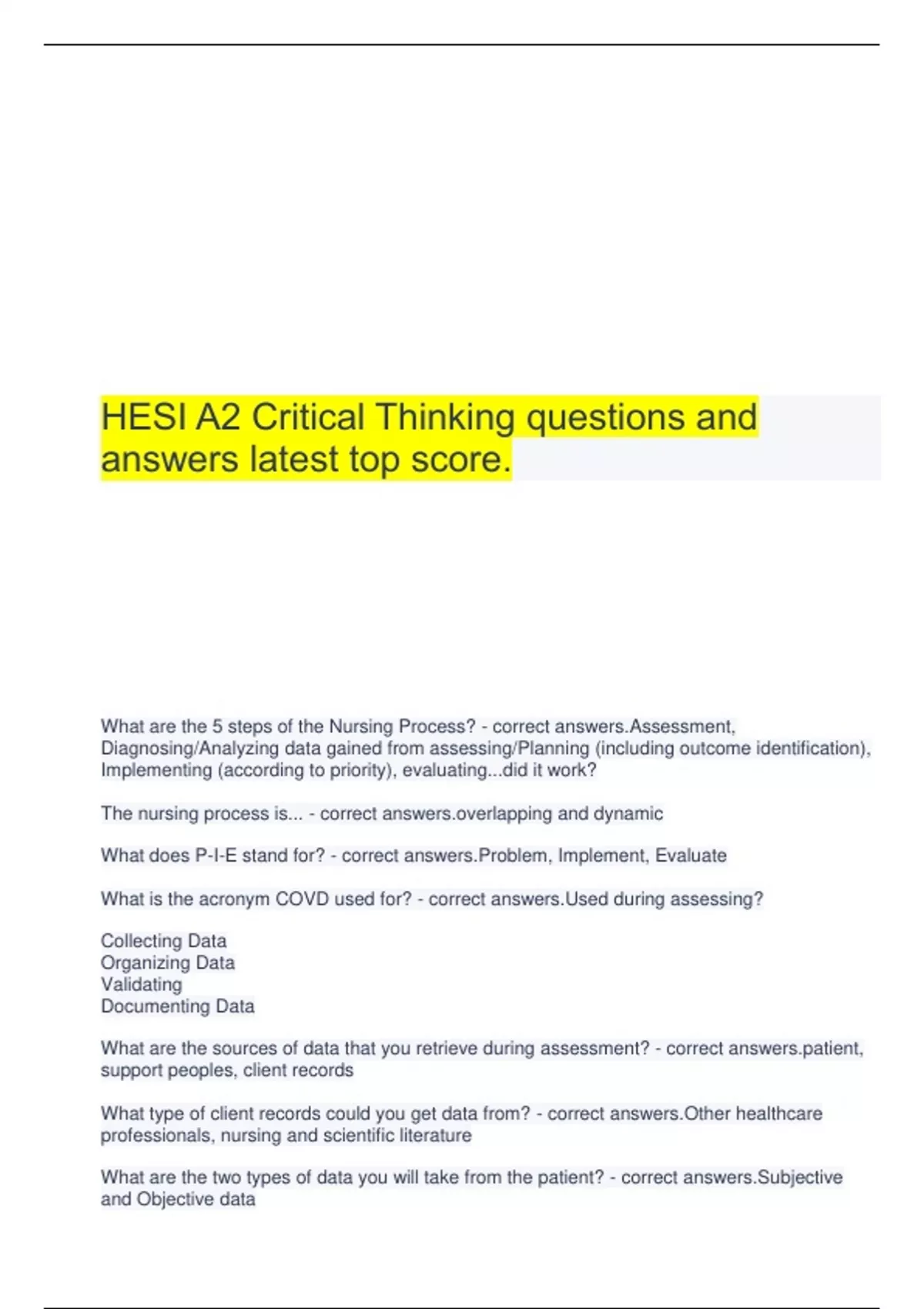HESI A2 Critical Thinking questions and answers latest top score. What are the 5 steps of the Nursing Process? - correct answers.Assessment, Diagnosing/Analyzing data gained from assessing/Planning (including outcome identification), Implementing (according to priority), evaluating...did it work? The nursing process is... - correct apping and dynamic What does P-I-E stand for? - correct answers.Problem, Implement, Evaluate What is the acronym COVD used for? - correct answers.Used during assessing? Collecting Data Organizing Data Validating Documenting Data What are the sources of data that you retrieve during assessment? - correct nt, support peoples, client records What type of client records could you get data from? - correct answers.Other healthcare professionals, nursing and scientific literature What are the two types of data you will take from the patient? - correct answers.Subjective and Objective data What is subjective data? - correct answers.Data that only the subject or "patient" can feel and will tell you. Usually in a statement. What is objective data? - correct answers.What you observe and can measure Besides measurable data for your objective data, what other objective data should you collect? - correct answers.What you see, hear, and smell. What do you do with your data sometimes if it is off or you are to sure of it? - correct answers.VALIDATE How do you record subjective data? - correct answers.In clients, "own words." What does the diagnoses do? - correct answers.Describes the patients health problem in nursing terminology - NOT medical. What are some qualifiers for diagnoses? - correct ient, impaired, decreased, ineffective or compromised What is etiology? - correct an