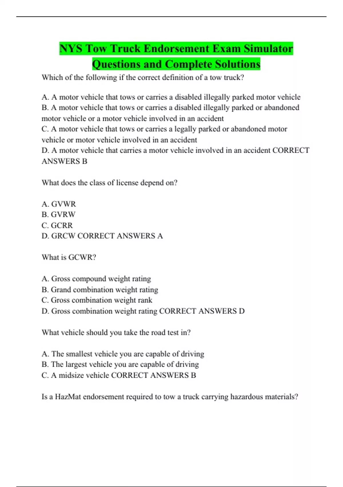 NYS Tow Truck Endorsement Exam Simulator