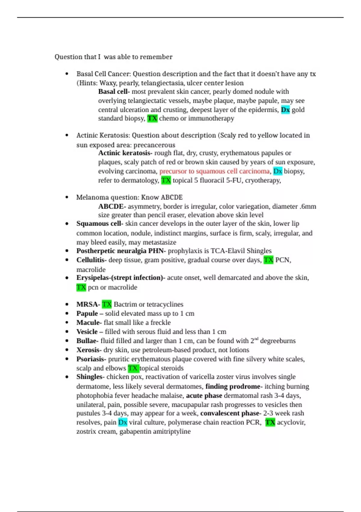 Question that I was able to remember Basal Cell Cancer: Question description and the fact that it doesn’t have any tx (Hints: Waxy, pearly, telangiectasia, ulcer center lesion Basal cell- most prevalent skin cancer, pearly domed nodule with overlying telangiectatic vessels, maybe plaque, maybe papule, may see central ulceration and crusting, deepest layer of the epidermis, Dx gold standard biopsy, TX chemo or immunotherapy Actinic Keratosis: Question about description (Scaly red to yellow located in sun exposed area: precancerous Actinic keratosis- rough flat, dry, crusty, erythematous papules or plaques, scaly patch of red or brown skin caused by years of sun exposure, evolving carcinoma, precursor to squamous cell carcinoma, Dx biopsy, refer to dermatology, TX topical 5 fluoracil 5-FU, cryotherapy, Melanoma question: Know ABCDE ABCDE- asymmetry, border is irregular, color variegation, diameter .6mm size greater than pencil eraser, elevation above skin level Squamous cell- skin cancer develops in the outer layer of the skin, lower lip common location, nodule, indistinct margins, surface is firm, scaly, irregular, and may bleed easily, may metastasize Postherpetic neuralgia PHN- prophylaxis is TCA-Elavil Shingles Cellulitis- deep tissue, gram positive, gradual course over days, TX PCN, macrolide Erysipelas-(strept infection)- acute onset, well demarcated and above the skin, TX pcn or macrolide MRSA- TX Bactrim or tetracyclines Papule – solid elevated mass up to 1 cm Macule- flat small like a freckle Vesicle – filled with serous fluid and less than 1 cm Bullae- fluid filled and larger than 1 cm, can be found with 2nd degreeburns Xerosis- dry skin, use petroleum-based product, not lotions Psoriasis- pruritic erythematous plaque covered with fine silvery white scales, scalp and elbows TX topical steroids Shingles- chicken pox, reactivation of varicella zoster virus involves single dermatome, less likely several dermatomes, finding prodrome- itching burning photophobia fever headache malaise, acute phase dermatomal rash 3-4 days, unilateral, pain, possible severe, macupapular rash progresses to vesicles then pustules 3-4 days, may appear for a week, convalescent phase- 2-3 week rash resolves, pain Dx viral culture, polymerase chain reaction PCR, TX acyclovir, zostrix cream, gabapentin amitriptyline Varicella: Chicken pox, starts on the FACE, spreads to trunk, arms and scalp. Prodrome of fever, pharyngitis, malaise., followed by 24, eruption of puritic vesicular lesions. Exanthem, erthematous puritic maculars develop to papules and fluid filled vesicles”drewdrops on a rose petal” Hairline and spread Shingles: herpes zoster: varicella virus infection: elderly. One dermatone Spider bite- TX abx on wound, cold packs nsaids Dog bite- treat with analgesia (Tylenol, nsaids, Demerol), Augmentin/doxycycline/Bactrim, wound cleaning with soap and water, betadine, local anesthesia (lidocaine), irrigated with 2000ml normal saline, betadine, wound debridement, facial bites should be closed with sutures only, pack wound, tetanus immunization, antibiotic therapy, Lyme disease- erythema migrans, (Borrelia burgdorferi) bulls eye rash, start within 72 hours of exposure, TX with doxycycline or amoxicillin, or azithromycin Dx two step test EIA and then western blot Lupus- multisystem autoimmune disease, characterized by remission and exacerbations, affects organs, skin kidney, heart, and blood vessels, face butterfly rash, avoid sunlight exposure, photosensitivity TX refer to rheumatologist, topical and oral steroids, avoid sun and cover skin Less seen in Caucasians Pityriasis rosea- exanthem, Christmas tree pattern rash, herald patch, normally on trunk, and limbs, oval erythematous-squamous scaly lesion. Pityriasis=bran, rosea=pink, last 5weeks Anthrax-bacterial infection, from animals, spores inhaled, caused dark scabs difficult to breath. TX doxycycline/ fluoroquinolones (Cipro) Tinea versicolor- trunk and extremities sun spots, lighten areas over darker skin Tinea corporis-(ringworm) arms/legs or body, fungal, Tx: mupirocin ointment Tinea cruris- jock itch Tinea capitas- skin or scalp Tinea pedis-athletes foot Psoriasis- cause pitting in finger nails Erthema Multiforme- Bulls Eye Rash.Infection. erythematous macule evolves into a papuleSX: skin, mouth lesions that ave pink-red center surrounded by pale ring border, can be painful and puritic. Hands. Bulla on lips vesicle filled large