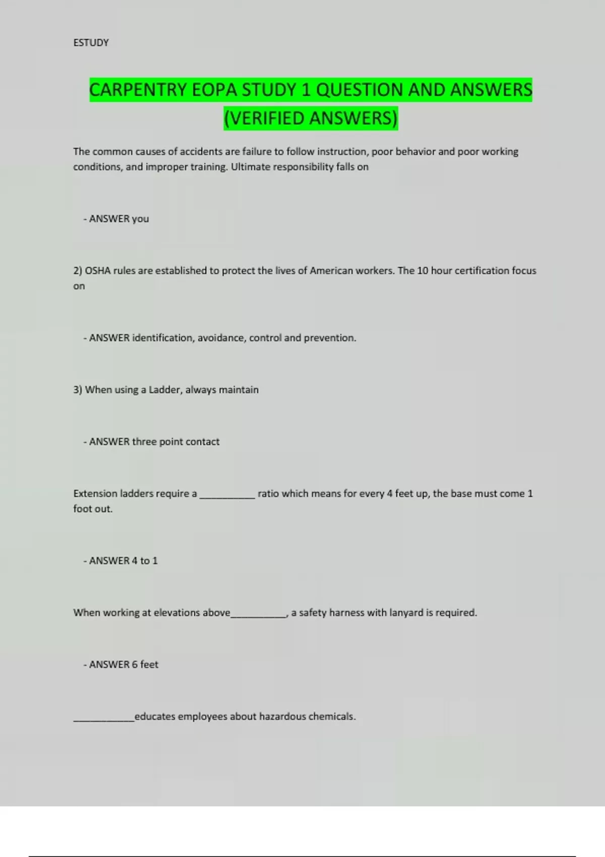 CARPENTRY EOPA STUDY 1 QUESTION AND ANSWERS (VERIFIED ANSWERS)