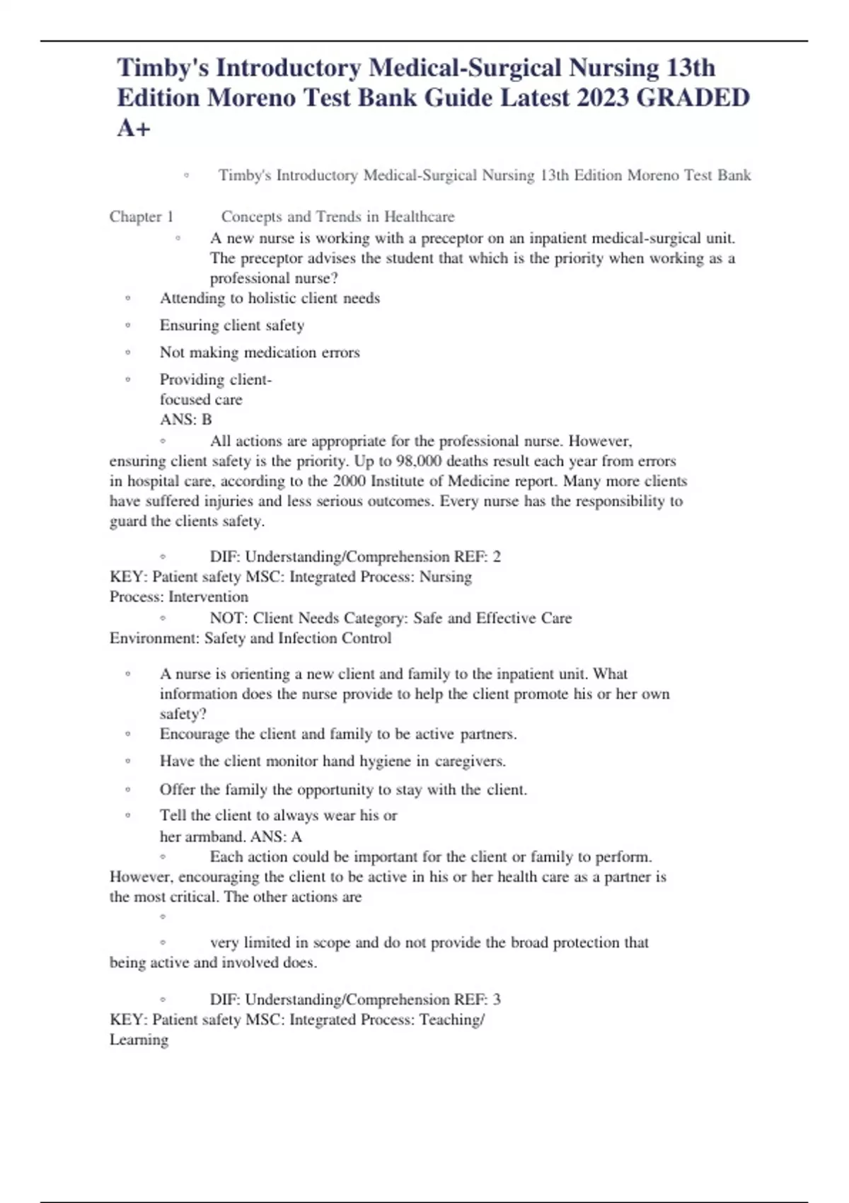 Timby's Introductory Medical-Surgical Nursing 13th Edition Moreno Test Bank Guide Latest 2023 GRADED A+