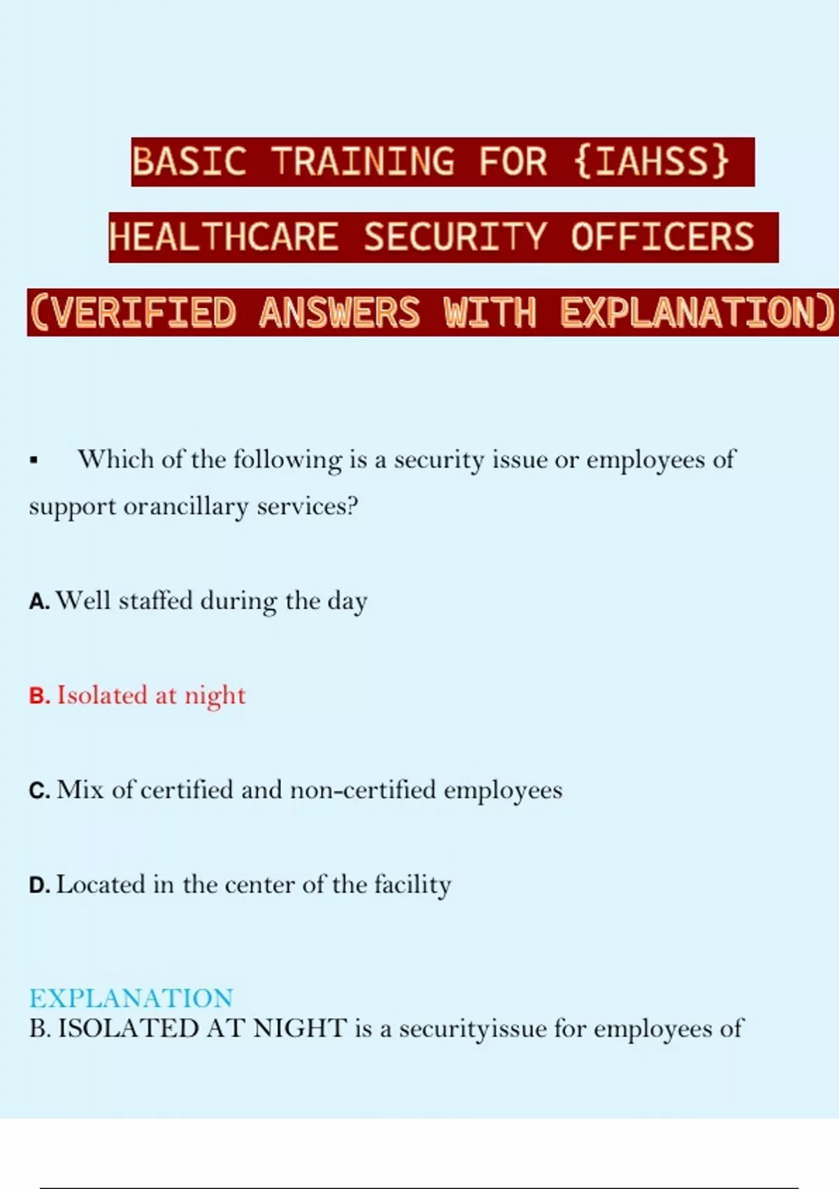 BASIC TRAINING FOR {IAHSS} HEALTHCARE SECURITY OFFICERS (VERIFIED ANSWERS WITH EXPLANATION) Which of the following is a security issue or employees of support orancillary services? A.Well staffed during the day B. Isolated at night C. Mix of certified and non-certified employees D. Located in the center of the facility EXPLANATION B. ISOLATED AT NIGHT is a securityissue for employees of support and ancillary services. ▪ Theft of film for its silver content is a risk for which department? A. Plan services B. Housekeeping C. Radiology D. Laboratory:C. Theft of film for its silver content is a risk for the EXPLANATION RADIOLOGYdepartment. ▪ Employees of which department are found all over the facility and oftenunlock all doors to the department they are working in at the time? A. Radiology B. Materials management C. Bio-medical engineering D. Housekeeping: EXPLANATION D. HOUSEKEEPING employees are found all over the facilityand often unlock all doors to the department they are working in at the time. ▪ The security department is considered which type of department? A. Support B. Clinical C. Direct patient care D. Service: EXPLANATION A. The security department is considered a SUPPORT department. ▪ Which of the following defines vulnerability? A.The act of being physically wounded B. Something with the potential to be physically wounded or open to attack or damage C. Possibility of loss D.The act of being attacked: EXPLANATION B. Vulnerability is defined as SOMETHING WITH THE POTENTIAL TO BE PHYSICALLY WOUNDED OR OPEN TO ATTACK ORDAMAGE. ▪ Which of the following is NOT an important risk measurement tool? A. Security inspections and surveys B. Security patrol and incident reports C. Law enforcement crime statistic reports and analyses D.Irregular patrols by untrained personnel: EXPLANATION D. IRREGULAR PATROLS BYUNTRAINED PERSONNEL is NOT an important risk measurement tool. ▪ Which of the following is NOT an appropriate response to a disturbance? A. Call for medical, security backup, or local police assistance, if required B. Observe or identify the person(s) causing the disturbance, and providearea and crowd control C. Step up to the people without backup D. Notify your supervisor other appropriate facility personnel per policy: EXPLANATION C.STEP UP TO THE PEOPLE WITHOUT BACKUP is NOT an appropriate responseto a disturbance. ▪ Which agency issued guidelines for workplace violence? A.The Joint Commission B. OSHA C. NFPA D.American society of Healthcare Engineers (ASHE): EXPLANATION B. OCCUPATIONAL SAFETY AND HEALTH ADMINISTRATION (OSHA) issued guidelines for work-place violence. ▪ Which of the following defines property risks? A. Lawsuits brought about by action or inaction, including negligent securityor safety hazards B. Loss of staff due to perception of an unsafe environment C.The healthcare organization'sinability to perform on or many of its normalfunctions, leading to the inability to generate income D. Damage, theft, or vandalism to buildings, equipment and supplies: EXPLANATION D. Property Risks is defined as DAMAGE, THEFT, OR VANDALISM TO BUILDINGS,EQUIPMENT AND SUPPLIES.