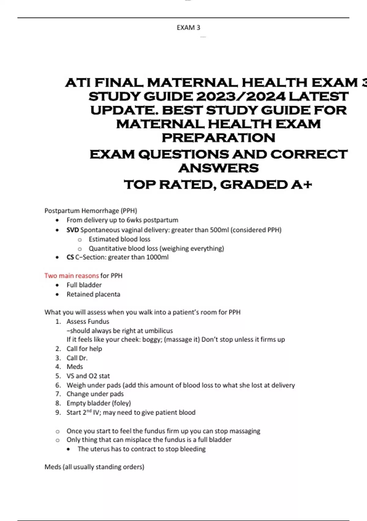 ATI FINAL MATERNAL HEALTH EXAM 3 STUDY GUIDE 2023/2024 LATEST UPDATE. BEST STUDY GUIDE FOR MATERNAL HEALTH EXAM PREPARATION EXAM QUESTIONS AND CORRECT ANSWERS TOP RATED, GRADED A+