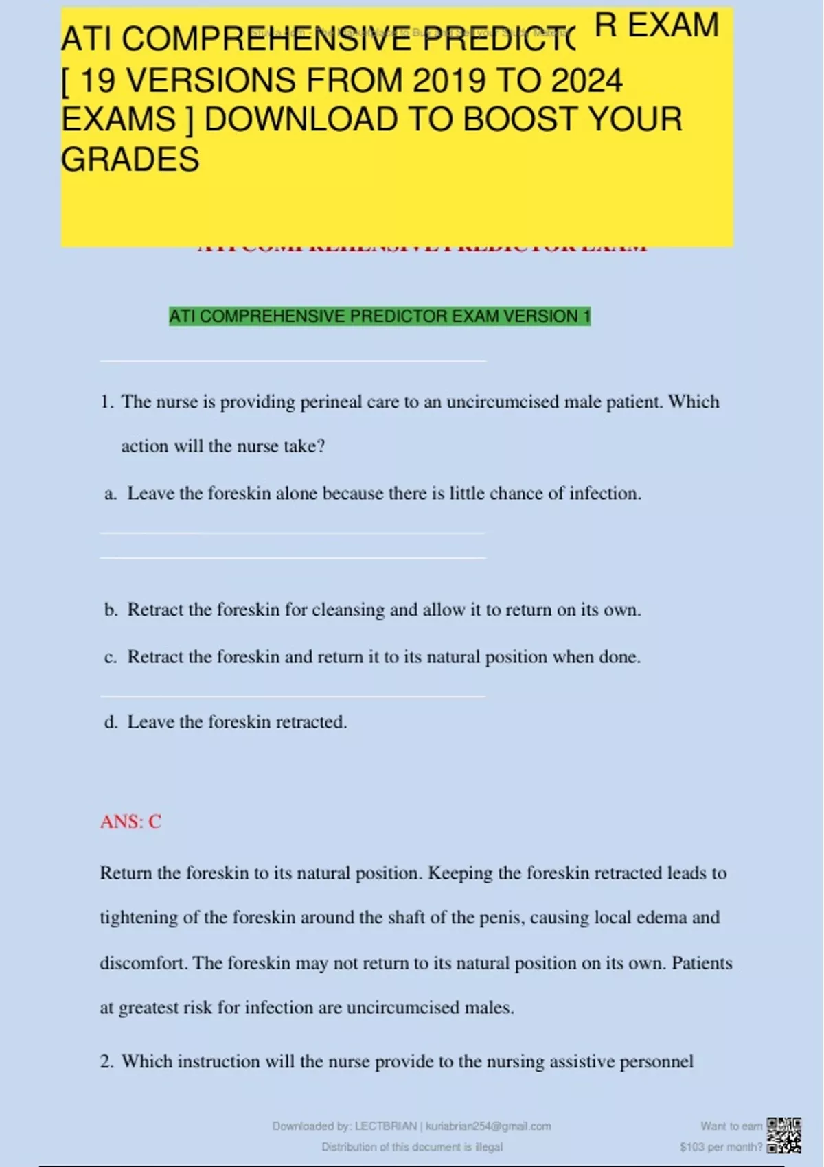 ATI COMPREHENSIVE PREDICTOR EXAM 100% LATEST [ 19 VERSIONS FROM EXAMS ] DOWNLOAD TO BOOST YOUR GRADES