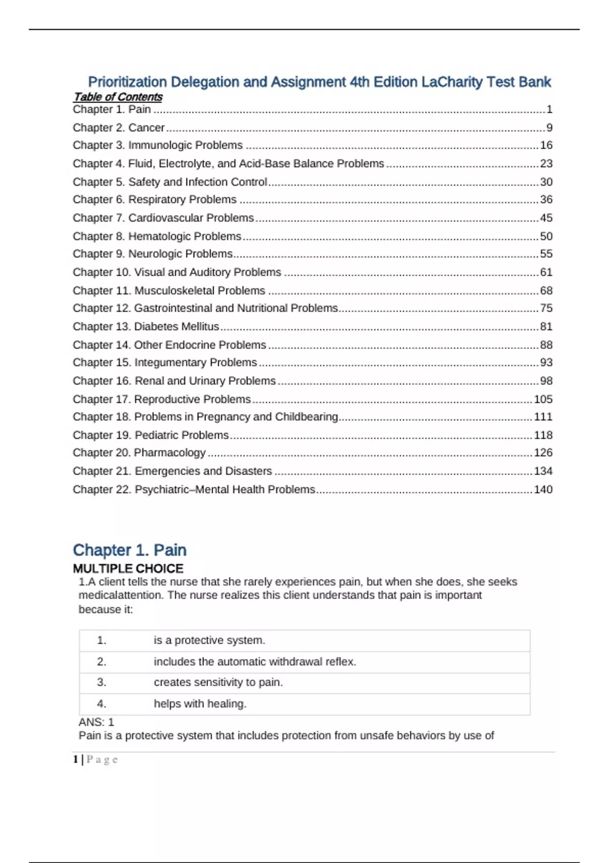 Test Bank Prioritization Delegation and Assignment 4th Edition LaCharityTable of Contents Chapter 1. Pain ........................................................................................................................... 1 Chapter 2. Cancer ....................................................................................................................... 9 Chapter 3. Immunologic Problems ............................................................................................ 16 Chapter 4. Fluid, Electrolyte, and Acid-Base Balance Problems ................................................ 23 Chapter 5. Safety and Infection Control ..................................................................................... 30 Chapter 6. Respiratory Problems .............................................................................................. 36 Chapter 7. Cardiovascular Problems ......................................................................................... 45 Chapter 8. Hematologic Problems ............................................................................................. 50 Chapter 9. Neurologic Problems ................................................................................................ 55 Chapter 10. Visual and Auditory Problems ................................................................................ 61 Chapter 11. Musculoskeletal Problems ..................................................................................... 68 Chapter 12. Gastrointestinal and Nutritional Problems ............................................................... 75 Chapter 13. Diabetes Mellitus .................................................................................................... 81 Chapter 14. Other Endocrine Problems ..................................................................................... 88 Chapter 15. Integumentary Problems ........................................................................................ 93 Chapter 16. Renal and Urinary Problems .................................................................................. 98 Chapter 17. Reproductive Problems ........................................................................................ 105 Chapter 18. Problems in Pregnancy and Childbearing............................................................. 111 Chapter 19. Pediatric Problems ............................................................................................... 118 Chapter 20. Pharmacology ...................................................................................................... 126 Chapter 21. Emergencies and Disasters ................................................................................. 134 Chapter 22. Psychiatric–Mental Health Problems .................................................................... 140 Chapter 1. Pain MULTIPLE CHOICE 1.A client tells the nurse that she rarely experiences pain, but when she does, she seeks medical attention. The nurse realizes this client understands that pain is important because it: 1. 2. 3. 4. is a protective system. includes the automatic withdrawal reflex. creates sensitivity to pain. helps with healing. ANS: 1 Pain is a protective system that includes protection from unsafe behaviors by use of 1 | P a g ereflexes, memory, and avoidance. Even though the automatic withdrawal reflex is a part of the pain response, it does not explain why pain is important. Pain does not create sensitivity to pain. Pain does not help with healing. PTS: 1 DIF: Analyze REF: Definitions and Implications of Pain 2.A client complains that the bed sheets touching his skin are extremely painful. The nurse realizes this client is experiencing: 1. 2. 3. 4. allodynia. modulation. kinesthesia. proprioception. ANS: 1 Allodynia or hyperalgesia is a state where a slight or nonpainful stimulus is interpreted as very painful. Kinesthesia is the awareness of movement. Proprioception is the awareness of body position. Modulation is an influencing factor in the perception of pain. PTS: 1 DIF: Analyze REF: Peripheral Nervous System 3.A client is complaining of severe abdomen pain. The nurse realizes this client is experiencing which type of pain? 1. 2. 3. 4. Neuralgia Pathological Somatic Visceral ANS: 4 Visceral pain is pain arising from the body organs or gastrointestinal tract. Somatic pain is pain that originates from the bone, joints, muscles, skin, or connective pain. Neuralgia and pathological pain are both types of pain that result from injury to a nerve or malfunction of the neuronal transmission process or due to impaired regulation. PTS:1DIF:AnalyzeREF:Types of Pain 4.A client, diagnosed with acute appendicitis, is experiencing abdominal pain. The best way for the nurse to describe this clients pain would be: 1. 2. 3. 4. chronic. neuropathic. referred. acute. ANS: 4 Acute pain onset is sudden and of short duration. Chronic pain is a sudden or slow onset of mild to severe pain that lasts longer than 6 months. Referred pain is the result of the transfer of visceral pain sensations to a body surface at a distance from the actual origin. Neuropathic pain is paroxysmal pain that occurs along the branches of a nerve. PTS:1DIF:ApplyREF:Types of Pain 2 | P a g e5.A client is observed holding a pillow over the abdominal region with both knees flexed in a side-lying position. Vital signs assessment reveals an elevated blood pressure and heart rate. Which of the following should the nurse say to this client? 1. 2. 3. 4. Can I get you anything? Would you like something for pain? You look comfortable. Your blood pressure is up. ANS: 2 Sympathetic responses to pain include elevated blood pressure and heart rate. And since the client is hugging a pillow over the abdominal region with both knees flexed in a side- lying position, the best thing for the nurse to say to this client is Would you like something for pain? The other responses are incorrect be
