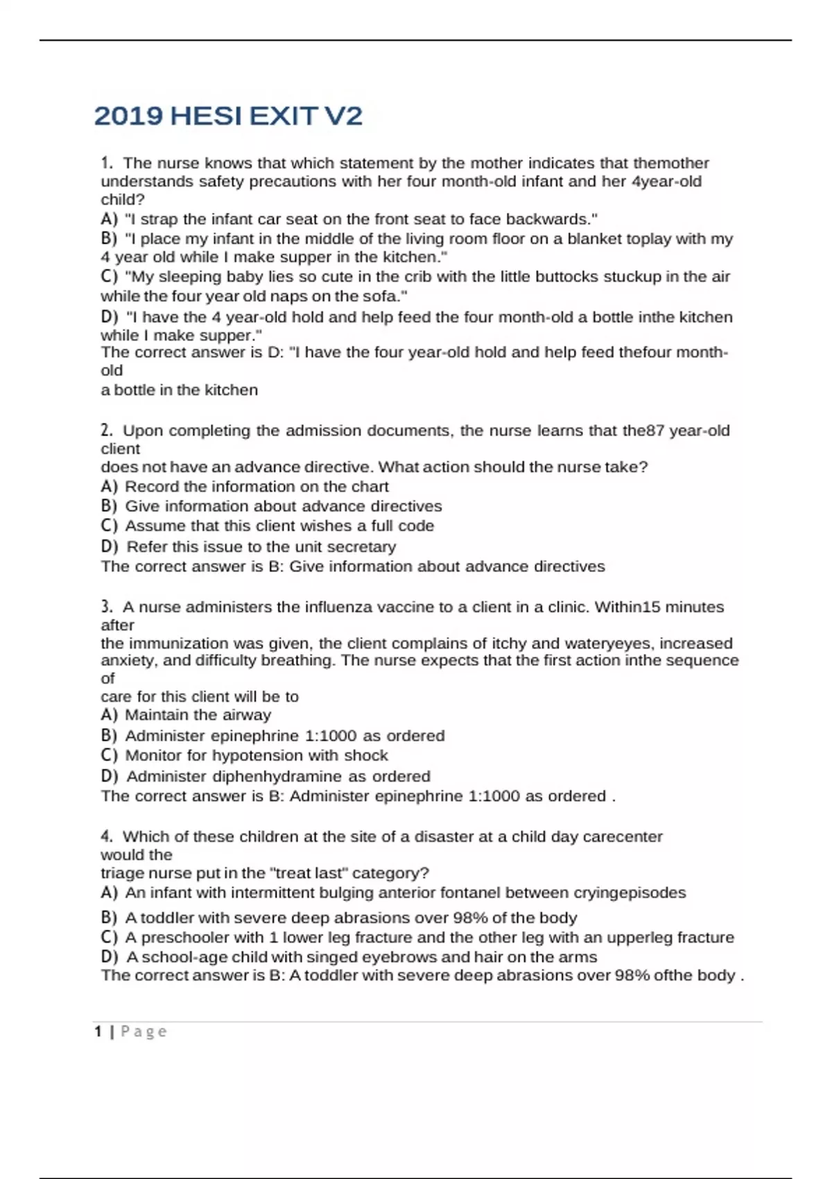 Hesi Exit V2 COMPLETE 160 QUESTION AND ANSWERS1. The nurse knows that which statement by the mother indicates that the mother understands safety precautions with her four month-old infant and her 4 year-old child? A) "I strap the infant car seat on the front seat to face backwards." B) "I place my infant in the middle of the living room floor on a blanket to play with my 4 year old while I make supper in the kitchen." C) "My sleeping baby lies so cute in the crib with the little buttocks stuck up in the air while the four year old naps on the sofa." D) "I have the 4 year-old hold and help feed the four month-old a bottle in the kitchen while I make supper." The correct answer is D: "I have the four year-old hold and help feed the four monthold a bottle in the kitchen 2. Upon completing the admission documents, the nurse learns that the 87 year-old client does not have an advance directive. What action should the nurse take? A) Record the information on the chart B) Give information about advance directives C) Assume that this client wishes a full code D) Refer this issue to the unit secretary The correct answer is B: Give information about advance directives 3. A nurse administers the influenza vaccine to a client in a clinic. Within 15 minutes after the immunization was given, the client complains of itchy and watery eyes, increased anxiety, and difficulty breathing. The nurse expects that the first action in the sequence of care for this client will be to A) Maintain the airway B) Administer epinephrine 1:1000 as ordered C) Monitor for hypotension with shock D) Administer diphenhydramine as ordered The correct answer is B: Administer epinephrine 1:1000 as ordered . 4. Which of these children at the site of a disaster at a child day care center would the triage nurse put in the "treat last" category? A) An infant with intermittent bulging anterior fontanel between crying episodes B) A toddler with severe deep abrasions over 98% of the body C) A preschooler with 1 lower leg fracture and the other leg with an upper leg fracture D) A school-age child with singed eyebrows and hair on the arms The correct answer is B: A toddler with severe deep abrasions over 98% of the body . 1 | P a g e5. When admitting a client to an acute care facility, an identification bracelet is sent up with the admission form. In the event these do not match, the nurse’s best action is to A) Change whichever item is incorrect to the correct information B) Use the bracelet and admission form until a replacement is supplied C) Notify the admissions office and wait to apply the bracelet D) Make a corrected identification bracelet for the client The correct answer is C: notify the admissions office and wait to apply the bracelet 6. The nurse is having difficulty reading the health care provider's written order that was written right before the shift change. What action should be taken? A) Leave the order for the oncoming staff to follow-up B) Contact the charge nurse for an interpretation C) Ask the pharmacy for assistance in the interpretation D) Call the provider for clarification The correct answer is D: Call the provider for clarification 7. An adult client is found to be unresponsive on morning rounds. After checking for responsiveness and calling for help, the next action that should be taken by the nurse is to: A) check the carotid pulse B) deliver 5 abdominal thrusts C) give 2 rescue breaths D) open the client's airway The correct answer is D: open the client''s airway 8. A client has an order for 1000 ml of D5W over an 8 hour period. The nurse discovers that 800 ml has been infused after 4 hours. What is the priority nursing action? A) Ask the client if there are any breathing problems B) Have the client void as much as possible C) Check the vital signs D) Auscultate the lungs The correct answer is D: Auscultate the lungs 9. Following change-of-shift report on an orthopedic unit, which client should the nurse see first? A) 16 year-old who had an open reduction of a fractured wrist 10 hours ago B) 20 year-old in skeletal traction for 2 weeks since a motor cycle accident C) 72 year-old recovering from surgery after a hip replacement 2 hours ago D) 75 year-old who is in skin traction prior to planned hip pinning surgery. The correct answer is C: 72 year-old recovering from surgery after a hip replacement 2 hours ago 2 | P a g e10. A nurse observes a family member administer a rectal suppository by having the client lie on the left side for the administration. The family member pushed the suppository until the finger went up to the second knuckle. After 10 minutes the client was told by the family member to turn to the right side and the client did this. What is the appropriate comment for the nurse to make? A) Why don’t we now have the client turn back to the left side. B) That was done correctly. Did you have any problems with the insertion? C) Let’s check to see if the suppository is in far enough. D) Did you feel any stool in the intestinal tract? The correct answer is B: That was done correctly. Did you have any problems with the insertion? 11. A client with a diagnosis of Methicillin resistant Staphylococcus aureus (MRSA) has died. Which type of precautions is the appropriate type to use when performing postmortem care? A) airborne precautions B) droplet precautions C) contact precautions D) compromised host precautions The correct answer is C: contact precautions 12. The nurse is reviewing with a client how to collect a clean catch urine specimen. Which sequence is appropriate teaching? A) Void a little, clean the meatus, then collect specimen B) clean the meatus, begin voiding, then catch urine stream C) Clean the meatus, then urinate into container D) Void continuously and catch some of the urine The correct answer is B: clean the meatus, begin voiding, then catch urine stream 13. The provider orders Lanoxin (digoxin) 0.125 mg PO and furosomide 40 mg every day. Which of these foods would the nurse re