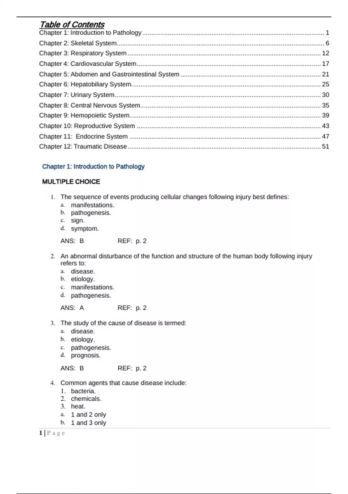 TEST BANK Radiographic Pathology for Technologists 6th Edition by Nina KowalczykTable of Contents Chapter 1: Introduction to Pathology .................................................................................................... 1 Chapter 2: Skeletal System .................................................................................................................. 6 Chapter 3: Respiratory System .......................................................................................................... 12 Chapter 4: Cardiovascular System ..................................................................................................... 17 Chapter 5: Abdomen and Gastrointestinal System ............................................................................. 21 Chapter 6: Hepatobiliary System ........................................................................................................ 25 Chapter 7: Urinary System ................................................................................................................. 30 Chapter 8: Central Nervous System ................................................................................................... 35 Chapter 9: Hemopoietic System......................................................................................................... 39 Chapter 10: Reproductive System ..................................................................................................... 43 Chapter 11: Endocrine System ......................................................................................................... 47 Chapter 12: Traumatic Disease .......................................................................................................... 51 Chapter 1: Introduction to Pathology MULTIPLE CHOICE 1. The sequence of events producing cellular changes following injury best defines: a. manifestations. b. pathogenesis. c. sign. d. symptom. ANS: B REF: p. 2 2. An abnormal disturbance of the function and structure of the human body following injury refers to: a. disease. b. etiology. c. manifestations. d. pathogenesis. ANS: A REF: p. 2 3. The study of the cause of disease is termed: a. disease. b. etiology. c. pathogenesis. d. prognosis. ANS: B REF: p. 2 4. Common agents that cause disease include: 1. bacteria. 2. chemicals. 3. heat. a. 1 and 2 only b. 1 and 3 only 1 | P a g ec. 2 and 3 only d. 1, 2, and 3 ANS: D REF: p. 2 5. A syndrome is best defined as: a. a genetic abnormality of a single protein. b. an adverse response to medical treatment. c. the patient’s perception of the disease. d. signs and symptoms that characterize a specific abnormal disturbance. ANS: D REF: p. 2 6. An adverse response to medical treatment itself is termed: a. autoimmune. b. iatrogenic. c. idiopathic. d. nosocomial. ANS: B REF: p. 3 7. Prognosis refers to: a. diseases usually having a quick onset. b. the name of the particular disease. c. the predicted course and outcome of the disease. d. the structure of cells or tissue. ANS: C REF: p. 3 8. Diseases that generally require a decrease in the exposure technique are considered: a. destructive. b. lytic. c. subtractive. d. all of the above. ANS: D REF: p. 3 9. The investigation of disease occurring in large groups best defines: a. epidemiology. b. incidence. c. prevalence. d. all of the above. ANS: A REF: p. 3 10. Data regarding the number of deaths caused by a particular disease averaged over a population are collected and reported by the: a. American College of Radiology. b. Centers for Disease Control. c. Food and Drug Administration. d. National Center for Health Statistics. ANS: D 2 | P a g e REF: p. 211. Which of the following are leading causes of death in the United States for adults aged 45 years and greater? 1. Heart disease 2. Malignant neoplasm 3. Polycystic kidney disease a. 1 and 2 only b. 1 and 3 only c. 2 and 3 only d. 1, 2, and 3 ANS: A REF: p. 4 12. In 2010, health spending accounted for approximately domestic product. a. 12 b. 17 c. 21 d. 33 ANS: B REF: p. 7 13. Each cell in the human body, except the reproductive cells, contains autosomal chromosomes and chromosomes. a. 11; 1 b. 11; 2 c. 22; 1 d. 22; 2 ANS: D REF: p. 8 14. The types of gene maps that grew out of the identification of DNA sequences include maps. 1. genetic 2. SNP 3. physical a. 1 and 2 only b. 1 and 3 only c. 2 and 3 only d. 1, 2, and 3 ANS: B REF: p. 8 15. The identification of common DNA pattern sequences and common patterns of genetic variations of single DNA bases resulted in: a. the Genome Project. b. genetic linkage maps. c. haplotype mapping. d. physical mapping. ANS: C REF: p. 8 16. Diseases that are present at birth from genetic or environmental factors are classified as: 3 | P a g e pairs of sex % of the U.S. grossa. congenital. b. degenerative. c. genetic. d. metabolic. ANS: A REF: p. 10 17. A genetic disorder caused by an abnormality on one of the 22 nonsex chromosomes is considered: a. autosomal. b. dominant. c. recessive. d. sex linked. ANS: A REF: p. 11 18. A protein coat surrounding a genome of either RNA or DNA without an organized cellular structure best describes which type of microorganism? a. Bacteria b. Fungi c. Virus d. All of the above ANS: C REF: p. 11 19. The ease with which a pathogenic organism can overcome the body’s defenses best describes: a. etiology. b. infection. c. pathogenesis. d. virulence. ANS: D REF: p. 12 20. Diseases caused by the disturbance of normal physiologic function are classified as: a. degenerative. b. metabolic. c. neoplastic. d. traumatic. ANS: B REF: p. 13 21. The lymph node into which the primary neoplasm drains during metastasis is termed the node. a. primary b. sentinel c. metastatic d. neoplastic ANS: B REF: p. 14 22. The spread of cancerous cells into surrounding tissue by virtue of the close proximity best describes: a. lymphatic spread. 4 | P a g eb. hematogenous spread. c. invasion. d. oncogenesis. ANS: C REF: p. 16 23. Cancer orig