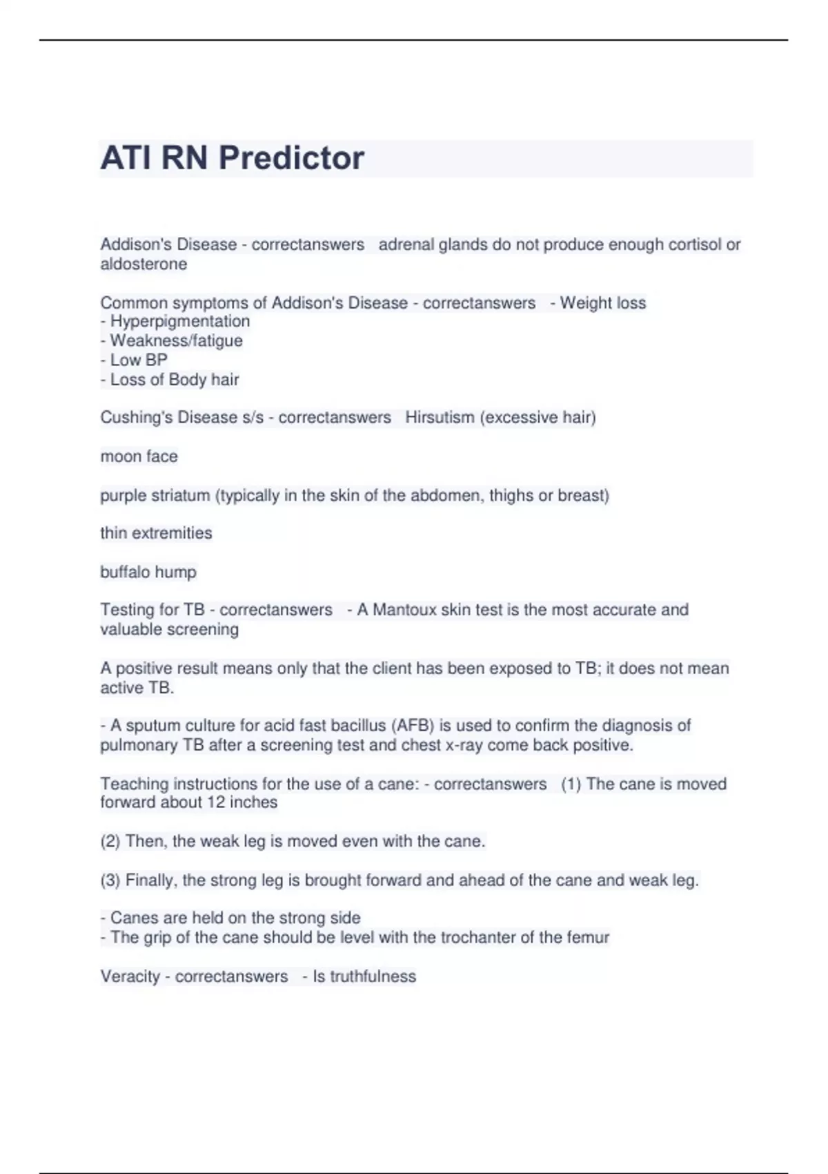 ATI RN Predictor Addison's Disease - correctanswers adrenal glands do not produce enough cortisol or aldosterone Common symptoms of Addison's Disease - correctanswers - Weight loss - Hyperpigmentation - Weakness/fatigue - Low BP - Loss of Body hair Cushing's Disease s/s - correctanswers Hirsutism (excessive hair) moon face purple striatum (typically in the skin of the abdomen, thighs or breast) thin extremities buffalo hump Testing for TB - correctanswers - A Mantoux skin test is the most accurate and valuable screening A positive result means only that the client has been exposed to TB; it does not mean active TB. - A sputum culture for acid fast bacillus (AFB) is used to confirm the diagnosis of pulmonary TB after a screening test and chest x-ray come back positive. Teaching instructions for the use of a cane: - correctanswers (1) The cane is moved forward about 12 inches (2) Then, the weak leg is moved even with the cane. (3) Finally, the strong leg is brought forward and ahead of the cane and weak leg. - Canes are held on the strong side - The grip of the cane should be level with the trochanter of the femur Veracity - correctanswers - Is truthfulness Autonomy - correctanswers - Is the right to independence and personal freedom, which leads to the primacy of self-determination Fidelity - correctanswers - Is the duty to keep promises Nonmaleficence - correctanswers - Is the obligation and duty to do no harm. Meningococcal vaccine - correctanswers - Recommended that this vaccine be given to children who are 11 through 12 years of age and then given a booster dose at age 16. When should the single dose of Herpes zoster vaccine be given? - correctanswers - To adults 60 years or older whether or not they report a previous episode of herpes zoster. Rotavirus should be given at what age? - correctanswers - During the child's first year of life. Alendronate (Fosamax) - correctanswers - This medi