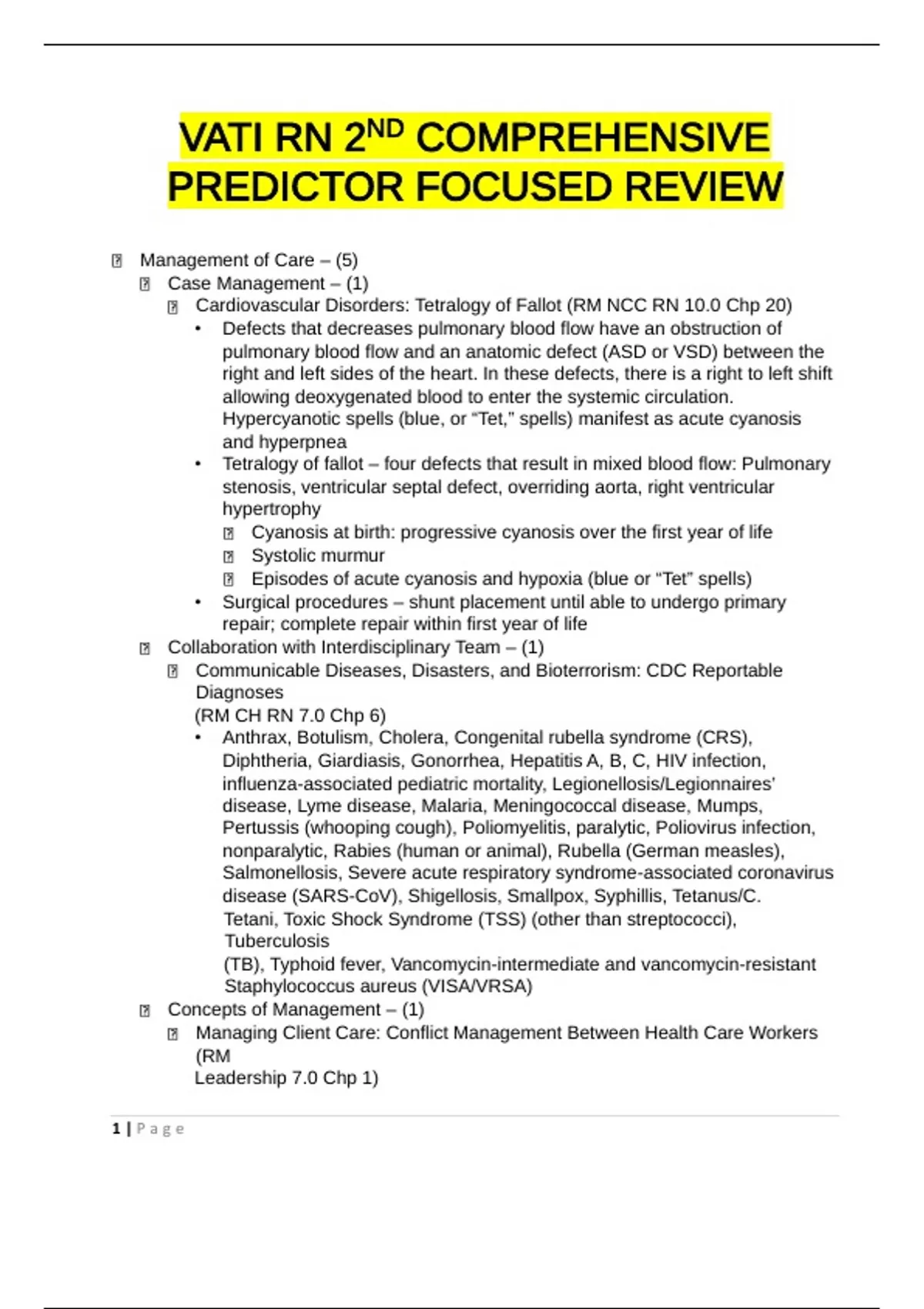 VATI RN 2ND COMPREHENSIVE PREDICTOR FOCUSED REVIEWManagement of Care – (5) Case Management – (1) Cardiovascular Disorders: Tetralogy of Fallot (RM NCC RN 10.0 Chp 20) • Defects that decreases pulmonary blood flow have an obstruction of pulmonary blood flow and an anatomic defect (ASD or VSD) between the right and left sides of the heart. In these defects, there is a right to left shift allowing deoxygenated blood to enter the systemic circulation. Hypercyanotic spells (blue, or “Tet,” spells) manifest as acute cyanosis and hyperpnea • Tetralogy of fallot – four defects that result in mixed blood flow: Pulmonary stenosis, ventricular septal defect, overriding aorta, right ventricular hypertrophy Cyanosis at birth: progressive cyanosis over the first year of life Systolic murmur Episodes of acute cyanosis and hypoxia (blue or “Tet” spells) • Surgical procedures – shunt placement until able to undergo primary repair; complete repair within first year of life Collaboration with Interdisciplinary Team – (1) Communicable Diseases, Disasters, and Bioterrorism: CDC Reportable Diagnoses (RM CH RN 7.0 Chp 6) • Anthrax, Botulism, Cholera, Congenital rubella syndrome (CRS), Diphtheria, Giardiasis, Gonorrhea, Hepatitis A, B, C, HIV infection, influenza-associated pediatric mortality, Legionellosis/Legionnaires’ disease, Lyme disease, Malaria, Meningococcal disease, Mumps, Pertussis (whooping cough), Poliomyelitis, paralytic, Poliovirus infection, nonparalytic, Rabies (human or animal), Rubella (German measles), Salmonellosis, Severe acute respiratory syndrome-associated coronavirus disease (SARS-CoV), Shigellosis, Smallpox, Syphillis, Tetanus/C. Tetani, Toxic Shock Syndrome (TSS) (other than streptococci), Tuberculosis (TB), Typhoid fever, Vancomycin-intermediate and vancomycin-resistant Staphylococcus aureus (VISA/VRSA) Concepts of Management – (1) Managing Client Care: Conflict Management Between Health Care Workers (RM Leadership 7.0 Chp 1) 1 | P a g e• Conflict is the result of opposing thoughts, ideas, feelings, perceptions, behaviors, values, opinions, or actions between individuals. Conflict is an inevitable part of professional, social, and personal life and can have constructive or destructive results. Nurses must understand conflict and how to manage it. Nurses can use problem-solving and negotiation strategies to prevent a problem from evolving into a conflict. Lack of conflict can create organizational stasis, while too much conflict can be demoralizing, produce anxiety, and contribute to burnout. Conflict can disrupt working relationships and create a stressful atmosphere. If conflict exists to the level that productivity and quality of care are compromised, the unit manager must attempt to identify the origin of the conflict and attempt to resolve it. Continuity of Care – (1) Information Technology: Change-of-Shift Report (RM FUND 9.0 Chp 5) • Nurses give this report at the conclusion of each shift ot the nurse assuming responsibility for the clients. Formats include face to face, audiotaping, or presentation during walking rounds in each client’s room (unless the client has a roommate or visitors are present). An effective report should: include significant objective information about the client’s health problems, proceed in a logical sequence, include no gossip or personal opinion, and relate recent changes in medications, treatments, procedures, and the discharge plan. Establishing Priorities – (1) Managing Client Care: Prioritizing Care of Postoperative Clients (RM Leadership 7.0 Chp 1) • Prioritize systemic before local (“life before limb”) • Prioritize acute (less opportunity for physical adaptation) before chronic (greater opportunity for physical adaptation) • Prioritize actual problems before potential future problems • Listen carefully to clients and don’t assume • Recognize and respond to trends vs. transient findings • Recognize indications of medical emergencies and complications vs. expected findings • Apply clinical knowledge to procedural standards to determine the priority actions Safety and Infection Control – (8) Accident/Error/Injury Prevention – (1) Seizures: Maintaining Seizure Precautions (RM NCC RN 10.0 Chp 13) • Maintain seizure precautions, including placing the bed in the lowest position and padding the side rails to prevent future injury. Emergency Response Plan – (1) Client Safety: Priority Action for Fire (RM FUND 9.0 Chp 12)• R: rescue and protect clients in close proximity to the fire by moving them to a safer location. Clients who are ambulatory may walk independently in a safe location • A: alarm: activate the facility’s alarm system and then report the fire’s details and location • C: contain/confine the fire by closing doors and windows and turning off any sources of oxygen and any electrical devices. Ventilate clients who are on life support with a bag valve mask • E: extinguish the fire is possible using the appropriate fire extinguisher Handling Hazardous and Infectious Materials – (1) Cancer Treatment Options: Implanted Internal Radiation Device (RM AMS RN 10.0 Chp 91) • Brachytherapy describes internal radiation that is placed close to the target tissue. This is done via placement in a body orifice (vagina) or body cavity (abdomen) or delivered via IV such as with radionuclide iodine, which is absorbed by the thyroid. Brachytherapy provides radiation to the tumor and a limited amount to surrounding normal tissues. Waste products are radioactive until the isotope has been completely eliminated from the body. Waste products should not be touched by anyone. Nursing considerations: Place the client in a private room away from other clients when possible. Keep door closed as much as possible. Place a sign on the door warning of the radiation source. Wear a dosimeter film badge that records personal amount of radiation exposure. Limit visitors to 30-min visits, and ha