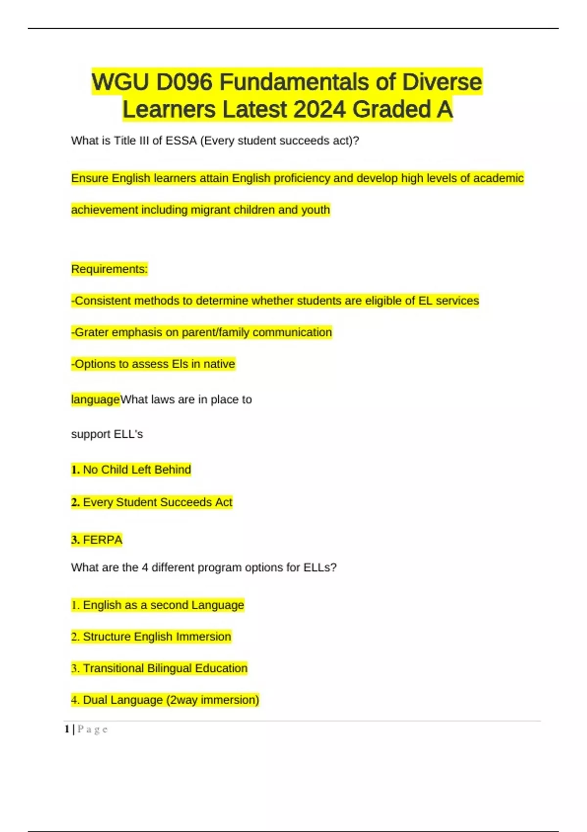WGU D096 Fundamentals of Diverse Learners LatestWhat is Title III of ESSA (Every student succeeds act)? Ensure English learners attain English proficiency and develop high levels of academic achievement including migrant children and youth Requirements: -Consistent methods to determine whether students are eligible of EL services -Grater emphasis on parent/family communication -Options to assess Els in native language What laws are in place to support ELL's 1. No Child Left Behind 2. Every Student Succeeds Act 3. FERPA What are the 4 different program options for ELLs? 1. English as a second Language 2. Structure English Immersion 3. Transitional Bilingual Education 4. Dual Language (2way immersion) 1 | P a g eWhat is English as a second language program? GOAL special curriculum to teach ELLs about the English language: academic vocab, develop English proficiency in speaking writing, reading listening with little use of ELL's primary language. What is structure English immersion (SEI) program? Implemented to ELL can transition and succeed in an English-only mainstream classroom with little use of ELL primary language. What is Transitional Bilingual Education (TBE) program? Program that maintains and develops skills in primary language while introducing, maintaining and developing skills in English. The goal is to transition into English instruction as skills build up. What is a dual language or two-way immersion program? A bilingual program where the goal is for the student to develop proficiencies in two languages. Normally classroom is 1/2 English and 1/2 other languages. What is WIDA (World-class Instructional Design and Assessment)? A group of state depts. of education to the design and implementation of high standards and equitable educational opportunities for ELL What are 5 steps to ensure instruction and assessments are aligned to state or national English language development standards 2 | P a g e1. Instruction focuses on providing ELL's with opportunities to engage in discipline- specific practices designed to build conceptional understand and language competence. 2. Instruction leverages Ell's home language, cultural assets, and prior knowledge. Make Connections. 3. Standards-aligned are rigorous, grade-level appropriate, and provided deliberate and appropriate scaffolding. 4. Instruction moves ELLs forward by analyzing English proficiency levels and prior school experience. 5. Instruction fosters ELLs autonomy by giving them strategies necessary to comprehend language. What is ADA (Americans with Disabilities Act) Civil Rights law prohibits disability discrimination by schools, employers and anyone who offers goods and services to the public. What is Every Student Succeeds Act (ESSA)? Replaced No child left behind. Its purpose is to make sure public schools provide a quality education for all kids. What is important about a 504 Plan? Rehabilitation Act (civil rights law) 3 | P a g eProvides Accommodations Focuses on HOW the student learns No Funding Impairment limits involvement in activities What are the major differences between 504 and IEP? Special education law-IDEA. specialized instruction. Focuses on WHAT the student is learning States receive funding Delineates specific IEP will turn into an after-school graduatiterm-109on success plan. students must have one of 13 specific qualifications. 4 levels of least Restrictive Environment 1. General Ed. Classroom with support-Spends entire day in the classroom and gets support services 2. Partial mainstream- spend part of the day in gen. ed then. 4 | P a g e3. Special education classroom- specialized for instruction for kids with similar needs. 4. Specialized program outside of district- private schools, programs, or hospital programs. What 4 Guidelines for discipline issues for students with disabilities? 1. Every child has the right to know the rules beforehand. 2. A change in placement might be used as discipline if protocols are followed. 3. Manifestation Determination must be considered