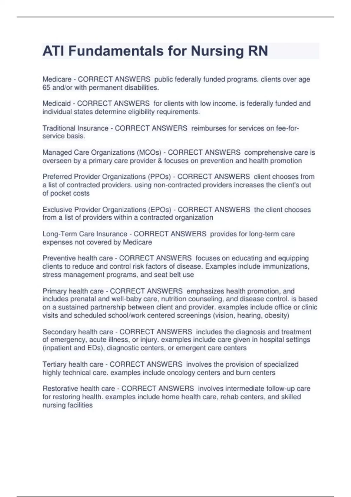 ATI Fundamentals for Nursing RN Medicare - CORRECT ANSWERS public federally funded programs. clients over age 65 and/or with permanent disabilities. Medicaid - CORRECT ANSWERS for clients with low income. is federally funded and individual states determine eligibility requirements. Traditional Insurance - CORRECT ANSWERS reimburses for services on fee-forservice basis. Managed Care Organizations (MCOs) - CORRECT ANSWERS comprehensive care is overseen by a primary care provider & focuses on prevention and health promotion Preferred Provider Organizations (PPOs) - CORRECT ANSWERS client chooses from a list of contracted providers. using non-contracted providers increases the client's out of pocket costs Exclusive Provider Organizations (EPOs) - CORRECT ANSWERS the client chooses from a list of providers within a contracted organization Long-Term Care Insurance - CORRECT ANSWERS provides for long-term care expenses not covered by Medicare Preventive health care - CORRECT ANSWERS focuses on educating and equipping clients to reduce and control risk factors of disease. Examples include immunizations, stress management programs, and seat belt use Primary health care - CORRECT ANSWERS emphasizes health promotion, and includes prenatal and well-baby care, nutrition counseling, and disease control. is based on a sustained partnership between client and provider. examples include office or clinic visits and scheduled school/work centered screenings (vision, hearing, obesity) Secondary health care - CORRECT ANSWERS includes the diagnosis and treatment of emergency, acute illness, or injury. examples include care given in hospital settings (inpatient and EDs), diagnostic centers, or emergent care centers Tertiary health care - CORRECT ANSWERS involves the provision of specialized highly technical care. examples include oncology centers and burn centers Restorative health care - CORRECT ANSWERS involves intermediate follow-up care for restoring health. examples include home health care, rehab centers, and skilled nursing facilities Continuing health care - CORRECT ANSWERS designed to address long-term or chronic health care needs. examples include hospice, adult day care, and in-home respite care Health care regulatory agencies include: - CORRECT ANSWERS -US Dept of Health and Human Srvcs -US FDA -State and local public health agencies -State licensing boards (to ensure providers & agencies comply with state regulations) -the Joint Commission/JCAHO (set quality standards for accreditation of health care facilities) -Professional Standards Review Organizations (PSROs) -Utilization review committees (monitor for appropriate diagnosis and treatment of hospitalized clients) Clergy - CORRECT ANSWERS Job: provide spiritual care to client (pastors, rabbis, priests) Refer to when: the client requests communication or the family asks for prayer prior to client undergoing a procedure Registered dietitian - CORRECT ANSWERS Job: assess, plan for, and educate the client reg. nutritional needs; direct care of nutritional aids Refer to when: ex- the client has low nutrient levels and/or experienced a recent unexplained weight loss Lab tech - CORRECT ANSWERS Job: obtain specimens of the client's body fluids and perform the necessary diagnostic tests Refer to when: ex- the provider orders a CBC to be performed immediately Occupational therapist - CORRECT ANSWERS Job: assess and plan for the client to regain ADLs, esp motor skills of the upper extremities; direct care of occupational therapy assistants Refer to when: ex- client has difficulties using an eating utensil with dominate hand following a stroke Pharmacist - CORRECT ANSWERS Job: provide & monitor meds for the client as prescribed by the provider; supervises pharm techs in states in which the practice is allowed Refer to when: client concerns over meds; dosage concerns; etc Physical Therapist - CORRECT ANSWERS Job: assess and plan for client to increase musculoskeletal functions, esp of lower extremities, to maintain mobility; direct care of physical therapy assistants Refer to when: ex- following a hip replacement, a client requires assistance learning to ambulate and regain strength Provider - CORRECT ANSWERS Job: assess, diagnose, and treat cllient for disease and/or injury; includes MDs, DOs, APNs, and PAs Refer to when: ex- client experiences change in vital signs Rad Tech - CORRECT ANSWERS Job: position client and perform x-rays and other imaging procedures for providers to review for diagnosis of disorders of various body parts Refer to when: ex- provider orders x-ray of client's hip after a fall Respiratory therapist - CORRECT ANSWERS Job: evaluate resp status and provide prescribed resp treatments including O2 therapy, chest physiotherapy, inhalation therapy, and artificial mechanical ventilation Refer to when: ex- client with resp disease experiences SOB and requests nebulizer treatment that is ordered PRN Social Worker - CORRECT ANSWERS Job: work with client and client's family by coordinating inpatient and community resources to meet psychosocial and environmental needs that are necessary for recovery and/or discharge Refer to when: ex- client dying of cancer wishes to go home but is unable to perform ADLs; the spouse needs med equipment in the home to care for client Speech therapist - CORRECT ANSWERS Job: evaluate and make recommendations regarding the functions of speech, language, and swallowing impacted by various client disorders or injuries; teach client techniques and exercises to improve function when possible Refer to when: ex- a client is having difficulty swallowing a regular diet after trauma to the head and neck Registered Nurse (RN) - CORRECT ANSWERS -Functions under state nurse practice laws -Perform assessments; establish nursing diagnoses, goals, and interventions; conducts ongoing client evaluations -Participate in developing interdisciplinary plans for client care -Share best practices; continuing education Licensed Practical N