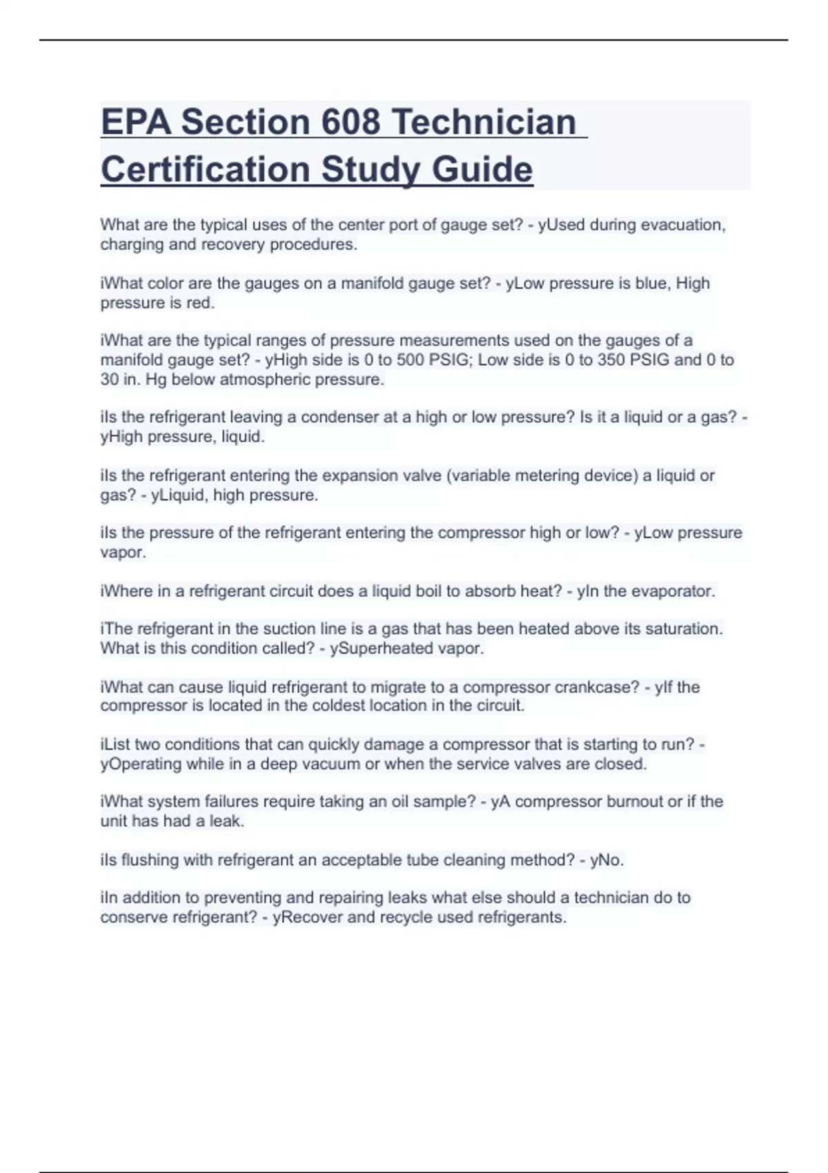 iWhat color are the gauges on a manifold gauge set? - yLow pressure is blue, High pressure is red. iWhat are the typical ranges of pressure measurements used on the gauges of a manifold gauge set? - yHigh side is 0 to 500 PSIG; Low side is 0 to 350 PSIG and 0 to 30 in. Hg below atmospheric pressure. iIs the refrigerant leaving a condenser at a high or low pressure? Is it a liquid or a gas? - yHigh pressure, liquid. iIs the refrigerant entering the expansion valve (variable metering device) a liquid or gas? - yLiquid, high pressure. iIs the pressure of the refrigerant entering the compressor high or low? - yLow pressure vapor. iWhere in a refrigerant circuit does a liquid boil to absorb heat? - yIn the evaporator. iThe refrigerant in the suction line is a gas that has been heated above its saturation. What is this condition called? - ySuperheated vapor. iWhat can cause liquid refrigerant to migrate to a compressor crankcase? - yIf the compressor is located in the coldest location in the circuit. iList two conditions that can quickly damage a compressor that is starting to run? - yOperating while in a deep vacuum or when the service valves are closed. iWhat system failures require taking an oil sample? - yA compressor burnout or if the unit has had a leak. iIs flushing with refrigerant an acceptable tube cleaning method? - yNo. iIn addition to preventing and repairing leaks what else should a technician do to conserve refrigerant? - yRecover and recycle used refrigerants. iWhat factors affect the speed of an evacuation? - yPump size, hose length, hose diameter, size of system to be evacuated, ambient temperature, suction line size, and the amount of moisture in the system. iHow should gauge set hoses be sized for use in evacuating a system? - yUse the shortest length and the largest diameter possible for the quickest evacuation. At least as large as the vacuum pump inlet. iWhen evacuating what is the benefit of using short hoses with large diameters? - yReduces emissions, pressure drop and evacuation time. iWhich connection determines the preferred size of hoses used with a vacuum pump? - yThe vacuum pump inlet. iAs the capacity and suction hose size increase what happens to the time needed for an evacuation? - yTime is reduced. iWhat purpose is served by heating a system during dehydration? - yTo speed up moisture removal. iDoes a thorough evacuation remove moisture from a system? - yYes. iWhat can happen to oil in the compressor if the moisture is left in an operating system? - yThe oil will form hydrofluoric and hydrochloric acids which will corrode the internal parts of the system. iWhat is the result of over-evacuating a system? - yNo damage will be done. iHow can a system be leak checked using a low pressure gauge? - yVacuum reading will rise when vacuum pump is turned off. iHow close should the vacuum gauge be connected to the vacuum pump during evacuation? - yAs far away as possible. iWhen measuring the vacuum of a system being evacuated the system must be isolated. What must be done to the vacuum pump? - yTurn it off and valve it off. iWhat is ozone? - y3 atoms of oxygen. It blocks much of the harmful ultraviolet radiation (uv-b) emitted from the sun and it keeps our earth's temperature stable. iHow much ozone can a chlorine atom destroy in the stratosphere? - yOne atom can destroy 100,000 ozone molecules. iWhat is Ozone Depletion Potential (ODP)? - yThe ability of any chemical to deplete the ozone layer. iWhat is CFC? - yChlorofluorocarbon. iWhich refrigerants are CFC's? - yR-11,12,113,114. iWhich chemical in the CFC refrigerants does the most damage to the ozone layer? - yChlorine. iWhat is an HCFC? - yHydrochlorofluorocarbons. iWhich refrigerants are HCFC's? - yR-22,123. iWhich is more harmful to the ozone layer a CFC or an HCFC? - yCFC's. iWhat is it about CFC's that make them more harmful to the stratosphere? - yChemical strength, they will not breakdown in the lower atmosphere. iWhat is an HFC? - yA fluorocarbon that contains no chlorine. iWhich refrigerants are HFC's? - yR-134a,404a,407c,410a. iWhat is the ODP of the HFC refrigerant? - yZero. iWhich refrigerants contain chlorine? - yCFC's and HCFC's. iWhich refrigerants have high ODP? - yCFC's.