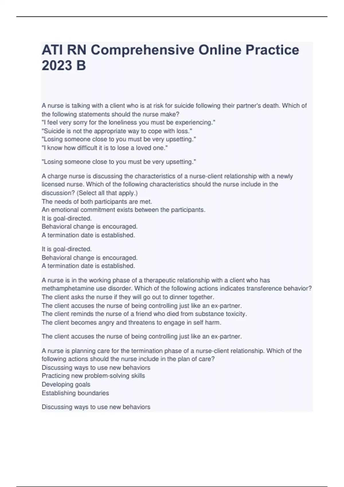 ATI RN Comprehensive Online Practice 2023 B A nurse is talking with a client who is at risk for suicide following their partner's death. Which of the following statements should the nurse make? "I feel very sorry for the loneliness you must be experiencing." "Suicide is not the appropriate way to cope with loss." "Losing someone close to you must be very upsetting." "I know how difficult it is to lose a loved one." "Losing someone close to you must be very upsetting." A charge nurse is discussing the characteristics of a nurse-client relationship with a newly licensed nurse. Which of the following characteristics should the nurse include in the discussion? (Select all that apply.) The needs of both participants are met. An emotional commitment exists between the participants. It is goal-directed. Behavioral change is encouraged. A termination date is established. It is goal-directed. Behavioral change is encouraged. A termination date is established. A nurse is in the working phase of a therapeutic relationship with a client who has methamphetamine use disorder. Which of the following actions indicates transference behavior? The client asks the nurse if they will go out to dinner together. The client accuses the nurse of being controlling just like an ex-partner. The client reminds the nurse of a friend who died from substance toxicity. The client becomes angry and threatens to engage in self harm. The client accuses the nurse of being controlling just like an ex-partner. A nurse is planning care for the termination phase of a nurse-client relationship. Which of the following actions should the nurse include in the plan of care? Discussing ways to use new behaviors Practicing new problem-solving skills Developing goals Establishing boundaries