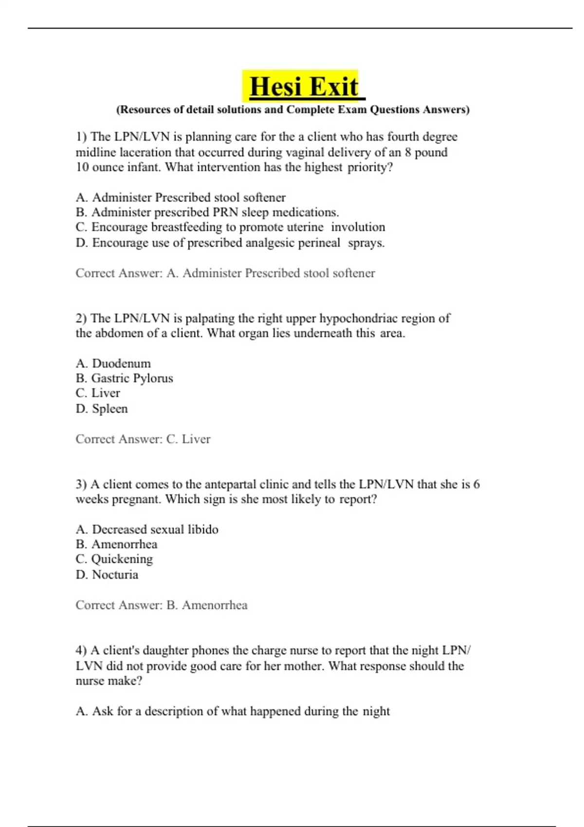 1) The LPN/LVN is planning care for the a client who has fourth degree midline laceration that occurred during vaginal delivery of an 8 pound 10 ounce infant. What intervention has the highest priority? A. Administer Prescribed stool softener B. Administer prescribed PRN sleep medications. C. Encourage breastfeeding to promote uterine involution D. Encourage use of prescribed analgesic perineal sprays. Correct Answer: A. Administer Prescribed stool softener 2) The LPN/LVN is palpating the right upper hypochondriac region of the abdomen of a client. What organ lies underneath this area. A. Duodenum B. Gastric Pylorus C. Liver D. Spleen Correct Answer: C. Liver 3) A client comes to the antepartal clinic and tells the LPN/LVN that she is 6 weeks pregnant. Which sign is she most likely to report? A. Decreased sexual libido B. Amenorrhea C. Quickening D. Nocturia Correct Answer: B. Amenorrhea 4) A client's daughter phones the charge nurse to report that the night LPN/ LVN did not provide good care for her mother. What response should the nurse make? A. Ask for a description of what happened during the night