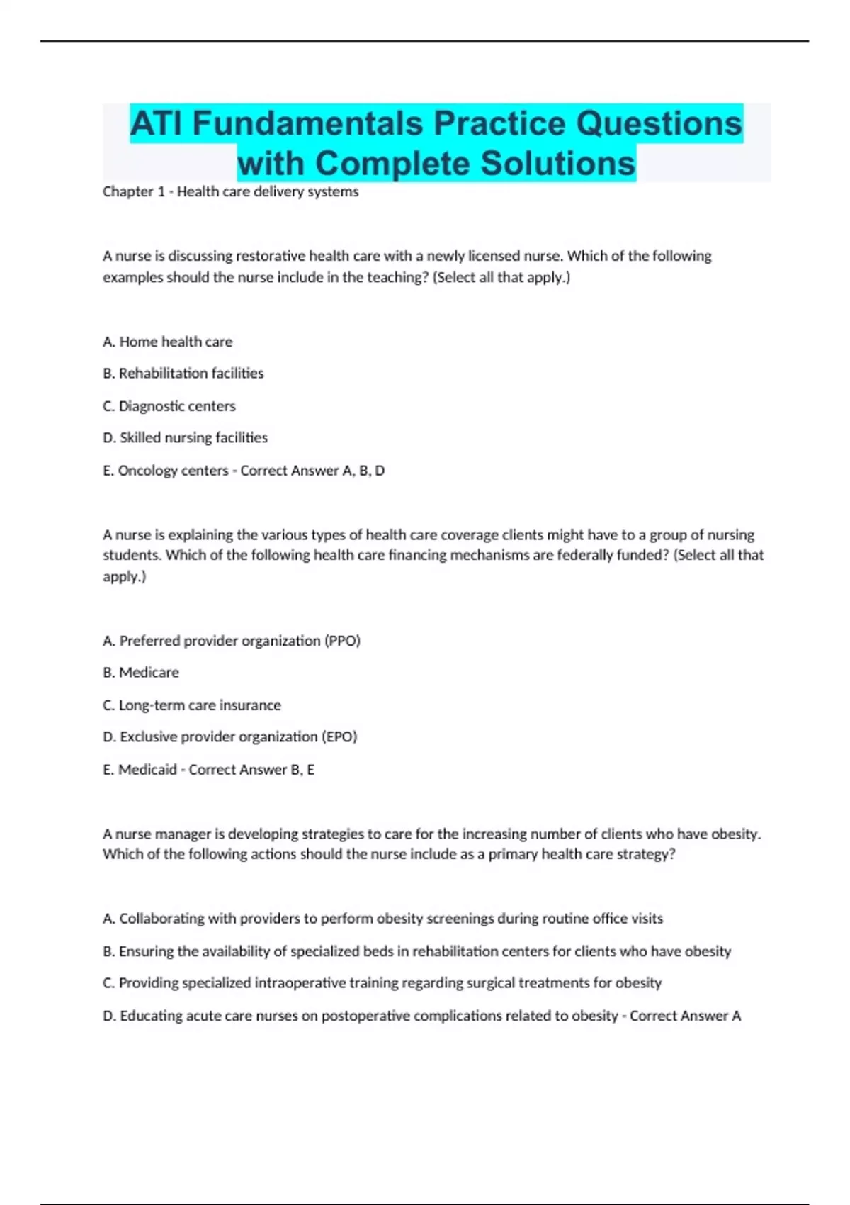 ATI Fundamentals Practice Questions with Complete Solutions Chapter 1 - Health care delivery systems A nurse is discussing restorative health care with a newly licensed nurse. Which of the following examples should the nurse include in the teaching? (Select all that apply.) A. Home health care B. Rehabilitation facilities C. Diagnostic centers D. Skilled nursing facilities E. Oncology centers - Correct Answer A, B, D A nurse is explaining the various types of health care coverage clients might have to a group of nursing students. Which of the following health care financing mechanisms are federally funded? (Select all that apply.) A. Preferred provider organization (PPO) B. Medicare C. Long term care insurance D. Exclusive provider organization (EPO) E. Medicaid - Correct Answer B, E A nurse manager is developing strategies to care for the increasing number of clients who have obesity. Which of the following actions should the nurse include as a primary health care strategy? A. Collaborating with providers to perform obesity screenings during routine office visits B. Ensuring the availability of specialized beds in rehabilitation centers for clients who have obesity C. Providing specialized intraoperative training regarding surgical treatments for obesity D. Educating acute care nurses on postoperative complications related to obesity - Correct