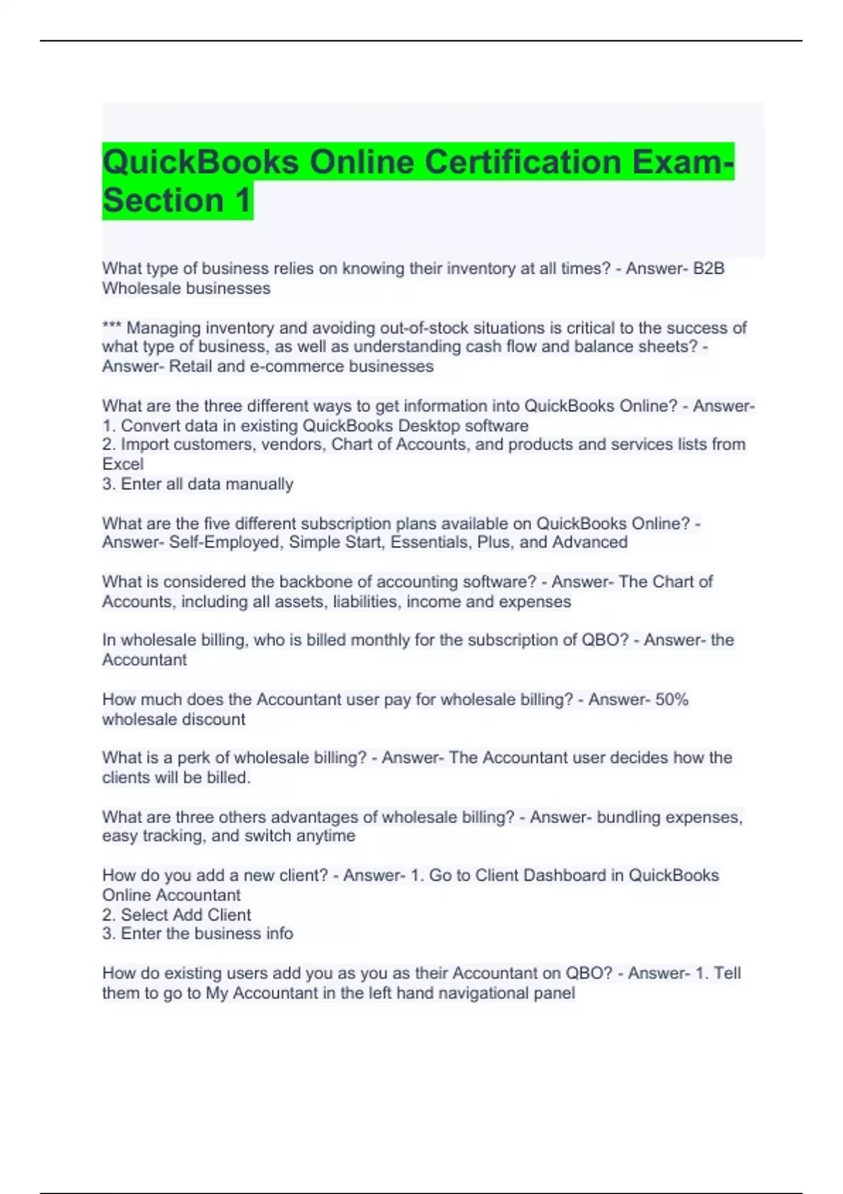 QuickBooks Online Certification Exam Question and Answers