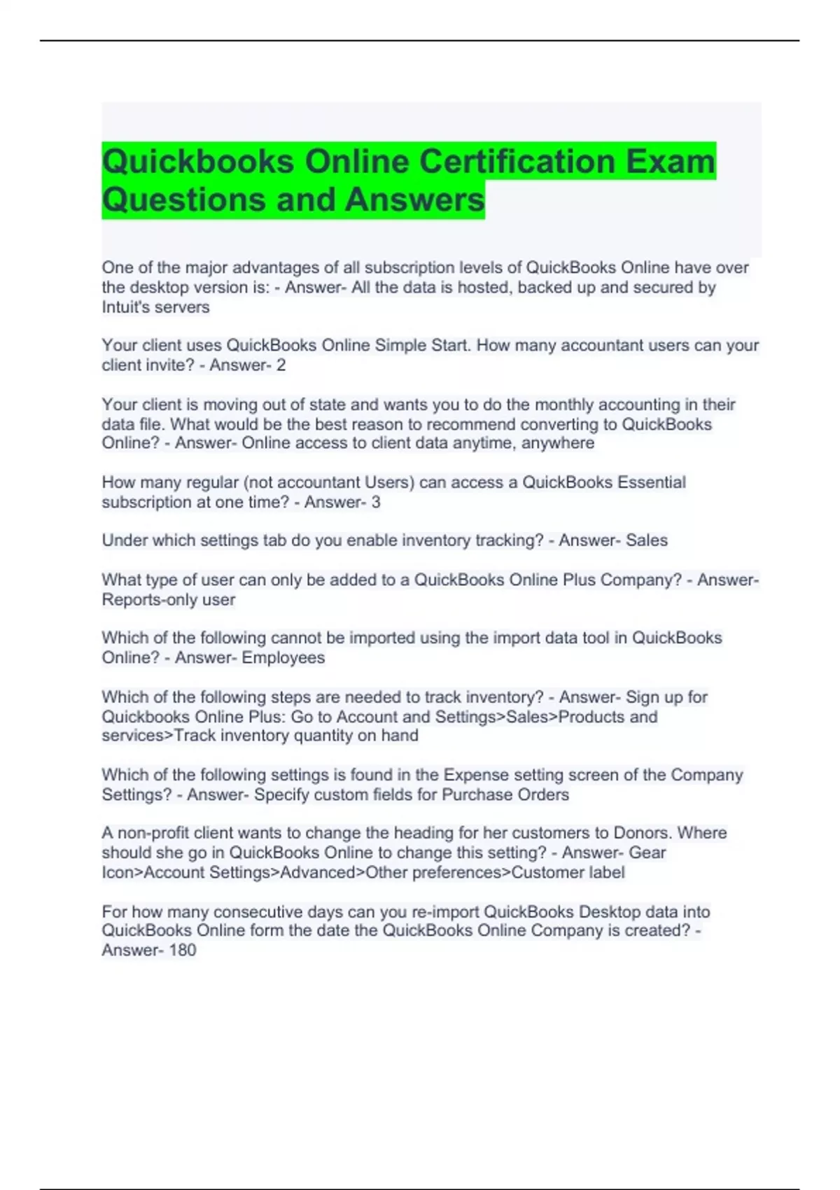 Quickbooks Online Certification Exam Questions and Answers | Graded A