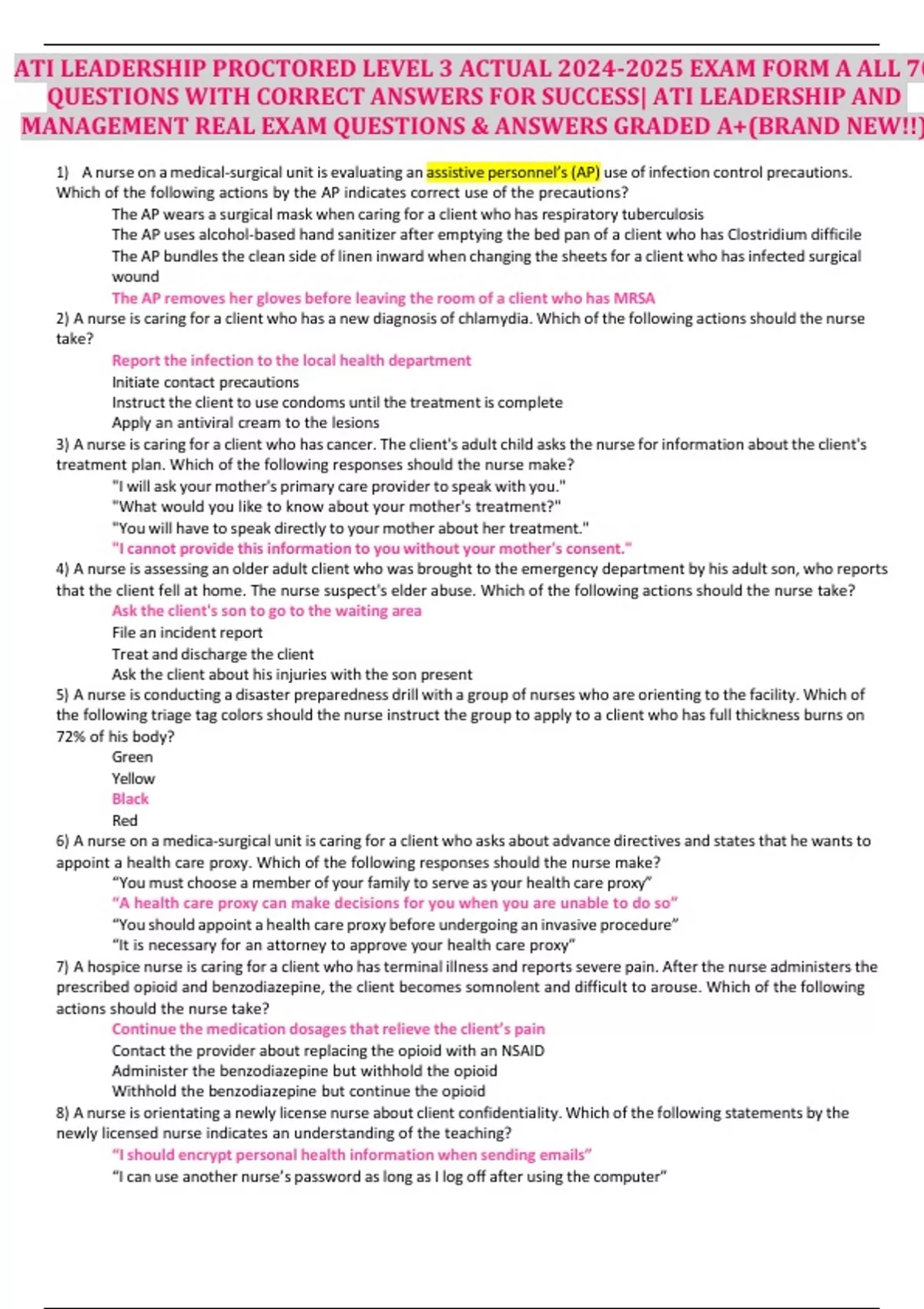 ATI LEADERSHIP PROCTORED LEVEL 3 ACTUAL EXAM FORM A ALL 70 QUESTIONS WITH CORRECT ANSWERS FOR SUCCESS| ATI LEADERSHIP AND MANAGEMENT REAL EXAM QUESTIONS & ANSWERS GRADED A+(BRAND NEW!!)