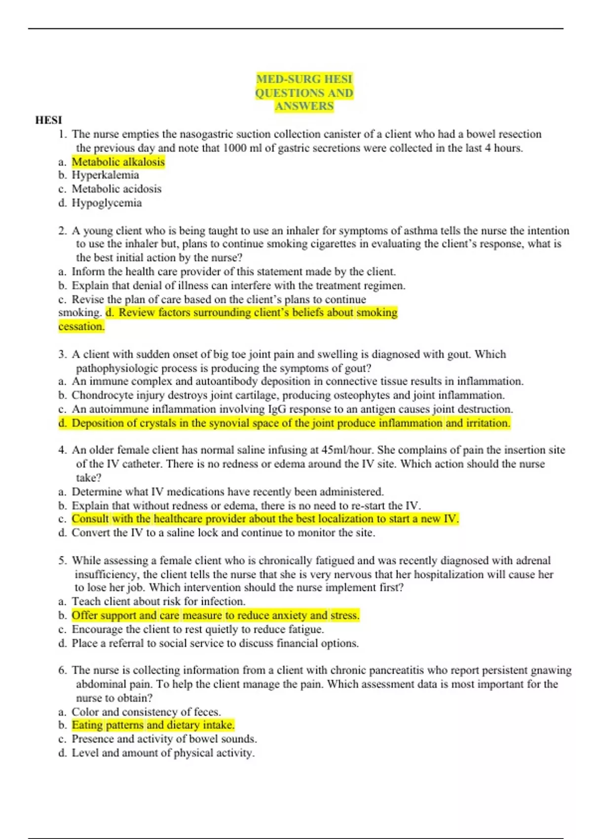 MED-SURG HESI QUESTIONS AND ANSWERS