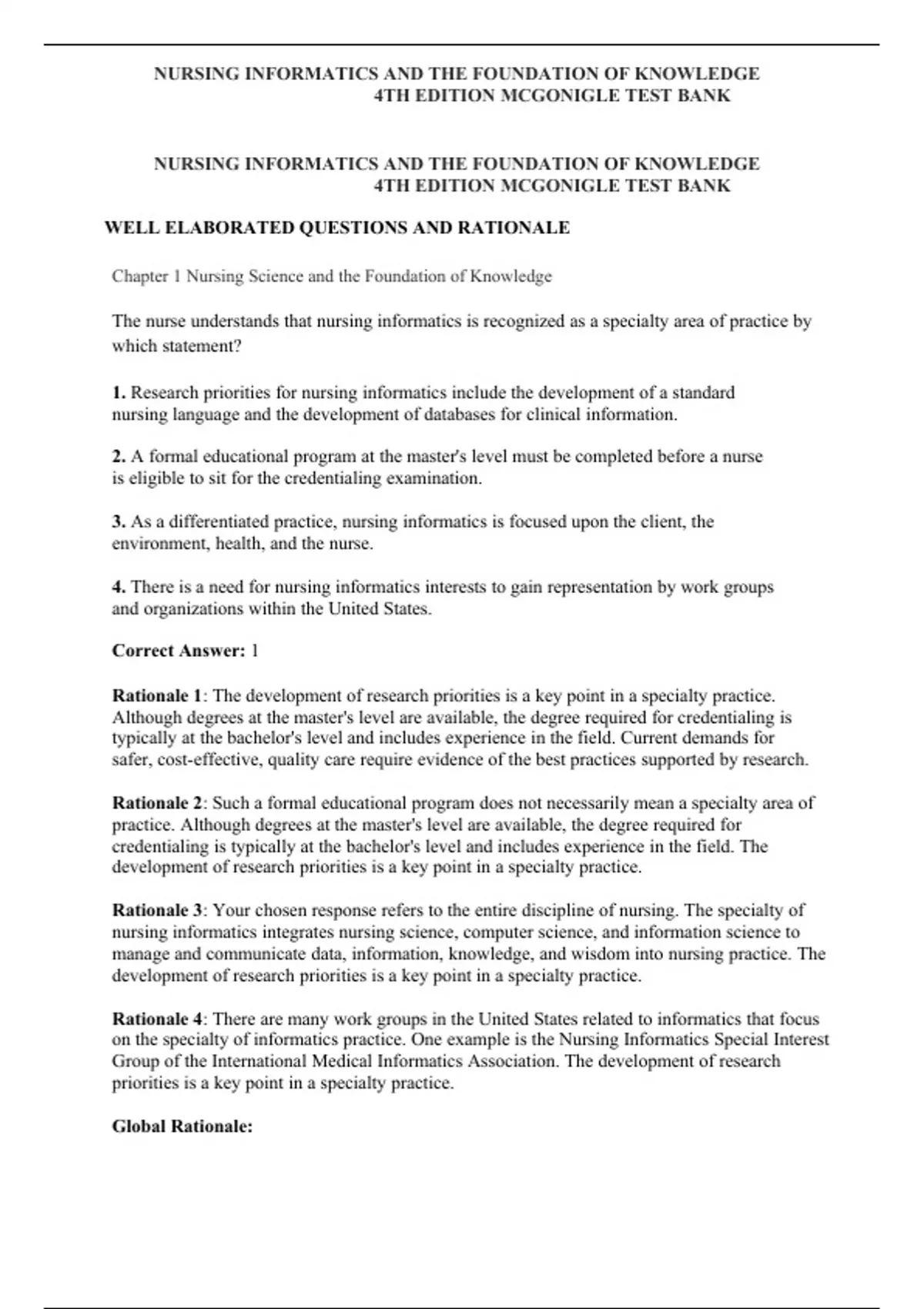 NURSING INFORMATICS AND THE FOUNDATION OF KNOWLEDGE 4TH EDITION MCGONIGLE TEST BANK WELL ELABORATED QUESTIONS AND RATIONALE