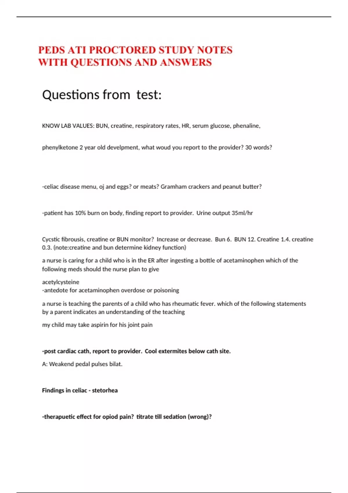 PEDS ATI PROCTORED STUDY NOTES WITH QUESTIONS AND ANSWERS