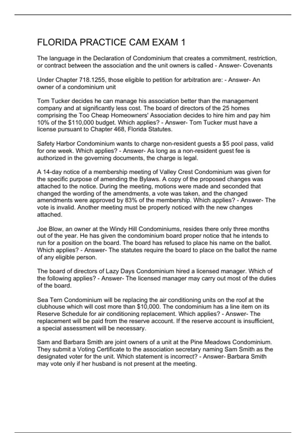 The language in the Declaration of Condominium that creates a commitment, restriction, or contract between the association and the unit owners is called - Answer- Covenants Under Chapter 718.1255, those eligible to petition for arbitration are: - Answer- An owner of a condominium unit Tom Tucker decides he can manage his association better than the management company and at significantly less cost. The board of directors of the 25 homes comprising the Too Cheap Homeowners' Association decides to hire him and pay him 10% of the $110,000 budget. Which applies? - Answer- Tom Tucker must have a license pursuant to Chapter 468, Florida Statutes. Safety Harbor Condominium wants to charge non-resident guests a $5 pool pass, valid for one week. Which applies? - Answer- As long as a non-resident guest fee is authorized in the governing documents, the charge is legal. A 14-day notice of a membership meeting of Valley Crest Condominium was given for the specific purpose of amending the Bylaws. A copy of the proposed changes was attached to the notice. During the meeting, motions were made and seconded that changed the wording of the amendments, a vote was taken, and the changed a