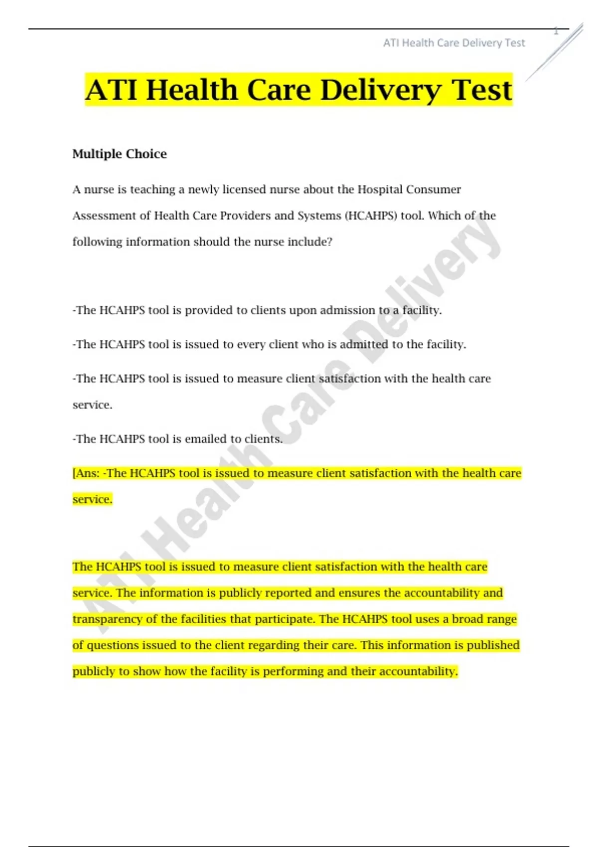 ATI Health Care Delivery Test | Questions Answered 100% Correct Multiple Choice A nurse is teaching a newly licensed nurse about the Hospital Consumer Assessment of Health Care Providers and Systems (HCAHPS) tool. Which of the following information should the nurse include? -The HCAHPS tool is provided to clients upon admission to a facility. -The HCAHPS tool is issued to every client who is admitted to the facility. -The HCAHPS tool is issued to measure client satisfaction with the health care service. -The HCAHPS tool is emailed to clients. [Ans: -The HCAHPS tool is issued to measure client satisfaction with the health care service. The HCAHPS tool is issued to measure client satisfaction with the health care service. The information is publicly reported and ensures the accountability and transparency of the facilities that participate. The HCAHPS tool uses a broad range of questions issued to the client regarding their care. This information is published publicly to show how the facility is performing and their accountability